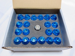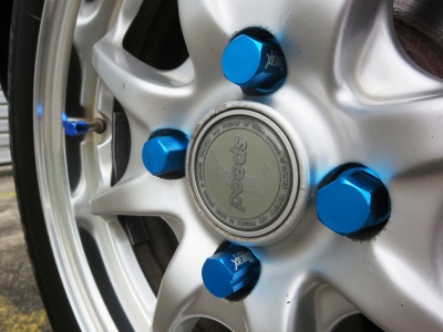 さらなるドレスアップとして、ステンレス製ナンバーボルトリング&エアバルブキャップセット(ブルー)、カーボン調ナンバーボルトカバー、Duraxのアルミ製レーシングナットも購入してしまいました。