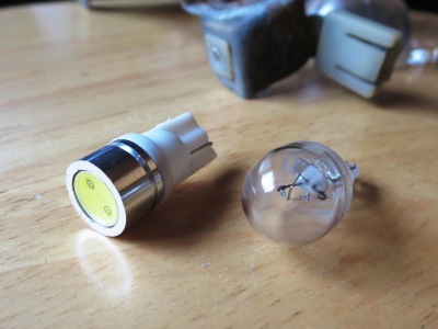 2017年春(その2)・ナンバー灯LED化 せっかく白ナンバー化したこともあって、2017年5月7日、今度は今さらですがナンバー灯のLED化に挑戦。といっても先日のナンバーボルトリング&エアバルブキャップセットとレーシングナット購入時に、1WのT10ウェッジ球がオマケに付いてきたので、さっそく使ってみようというわけです。ちなみにウェッジ球というのは、ねじ込み式ではなく差し込み式の電球のこと。T10の10は電球部分の全長(mm)を表し、ビートのナンバー灯の指定サイズはT13なのですが、差し込み部分はT10、T13、T16で共通のため、ランプカバーに収まりさえすればこの3つには互換性があるのです。従来の電球を外して交換するだけらしいのですが、果たしてうまくいくのか…。ちなみに画像ではナンバープレートフレームを装着するためにナンバープレートを外していますがナンバー灯交換にナンバープレートを外す必要はありません。もちろんリアバンパーを外す必要もありません。