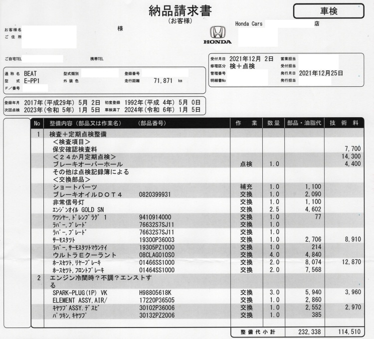 11月27日、ビートが14回目の車検を受けることになりました。これまでお世話になっていたディーラーが県内とは言え遠方のため(NSXの面倒を見ていただいているホンダカーズも県内の別の遠方のディーラー)コロナ禍で引き取りにいけないということで、奥さんが利用している市内のホンダカーズにお願いすることにしました。