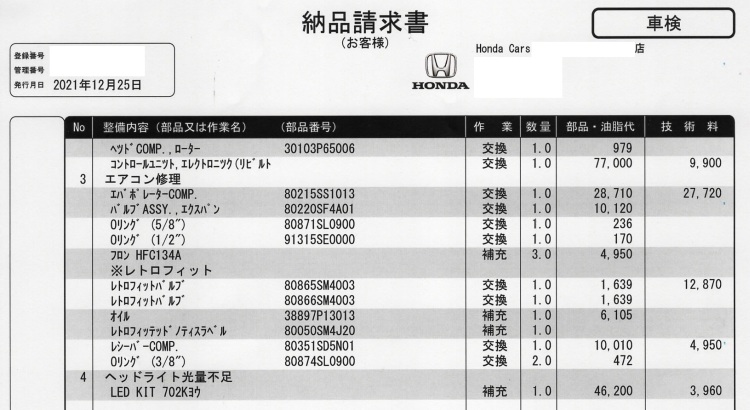 1週間後に工場長さんから連絡があり、10月上旬からのエンジンの不調は再現できなくて保留中とのこと。効かなくなっていたエアコンについては、 以前ヤフオクで購入してあった高価なフロンガスR12を事前に持ち込んでいたのですが、憧れのR134a対応キットを提案してくださいました。