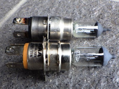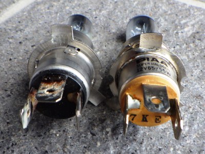 ▲外したハロゲンバルブは片方がスタンレー製でもう片方がPIAA製でした。スタンレー製の方がおそらく純正品と思われます。交換歴があるようです。