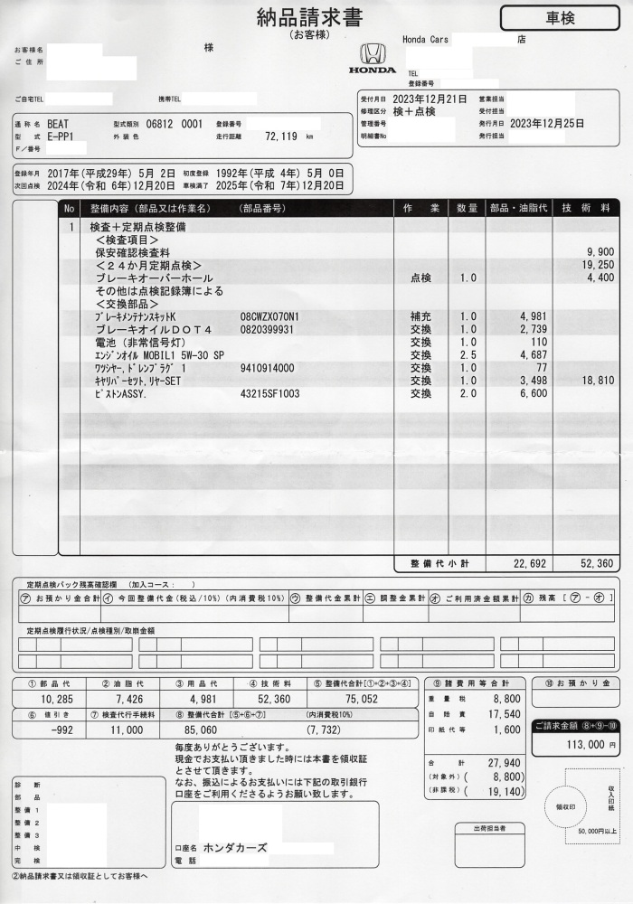 11月24日、ビートを16回目の車検に出しました。今年の4月から2か月前車検が可能になったので、雪が降り始める前に出せました。次男にディーラーまでCR-Zで付き合ってもらい、そのまま乗せて帰ってもらったため代車はなし。