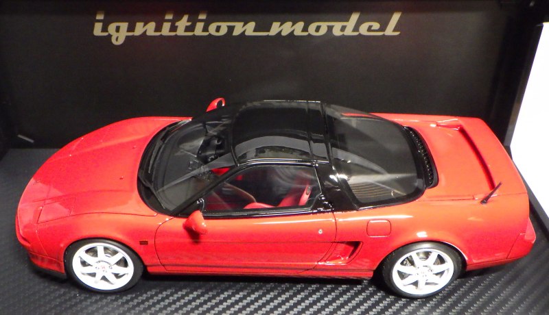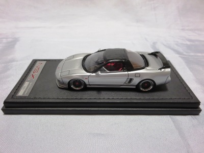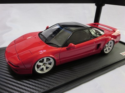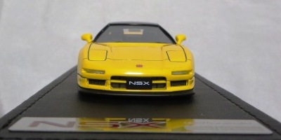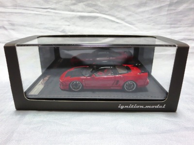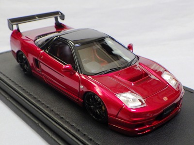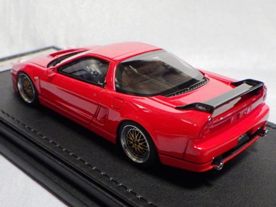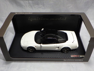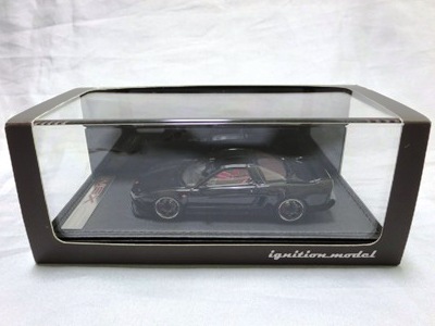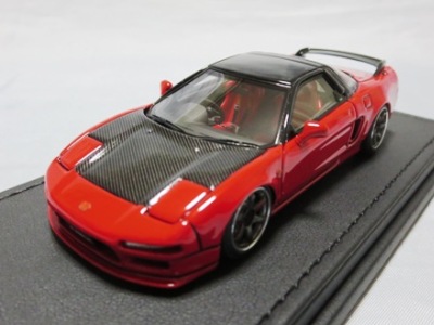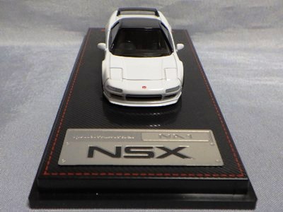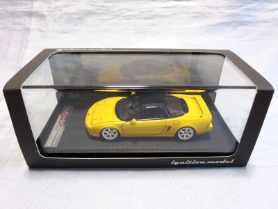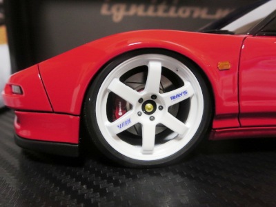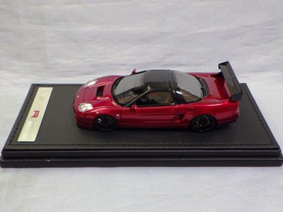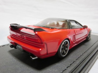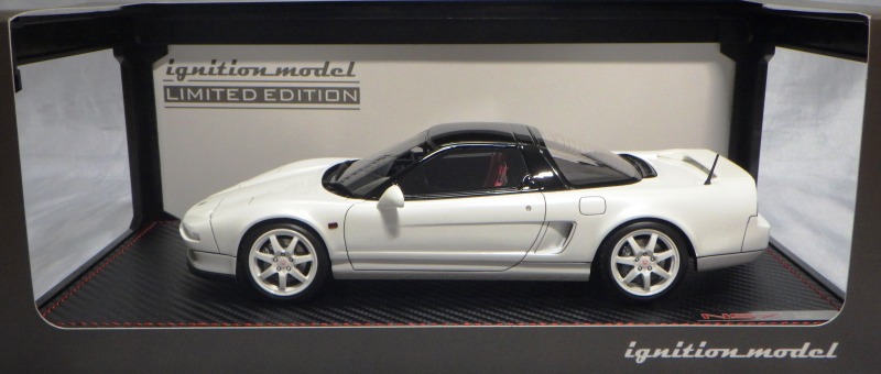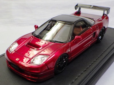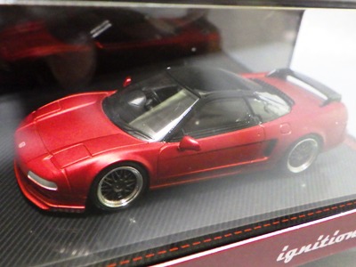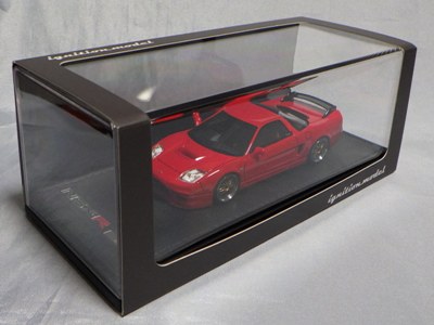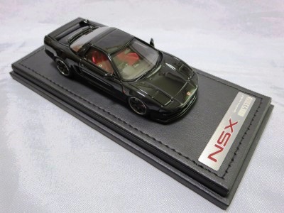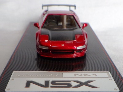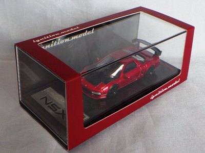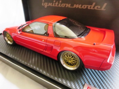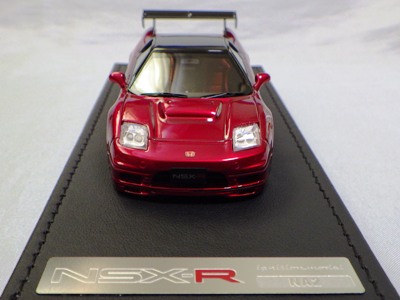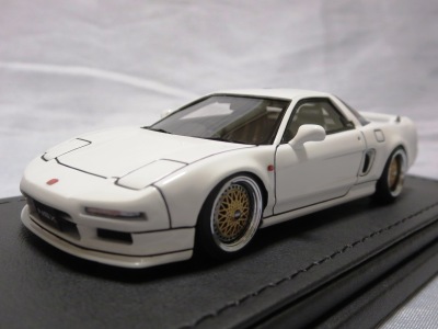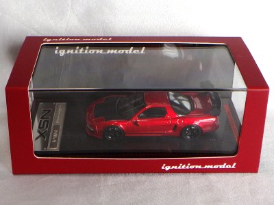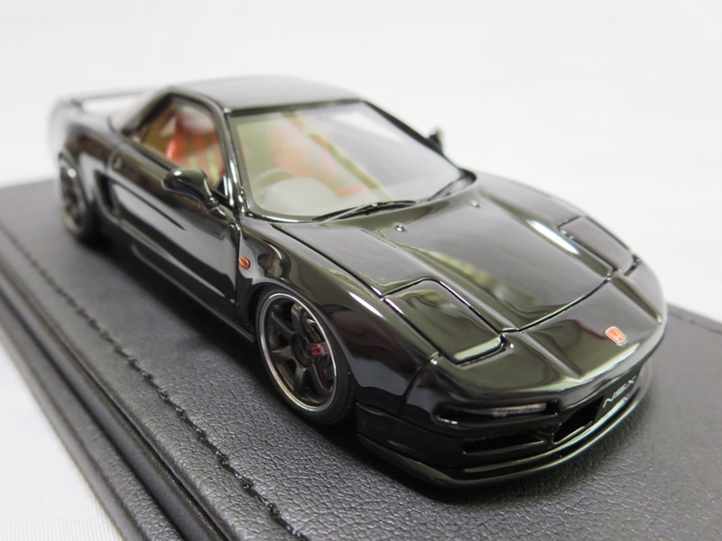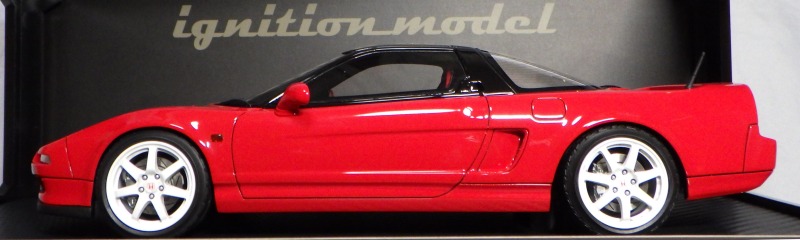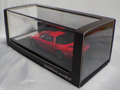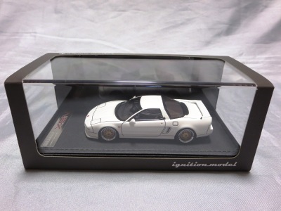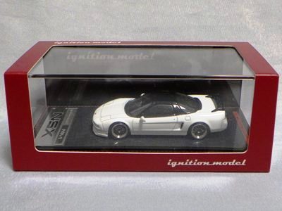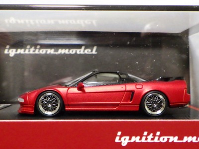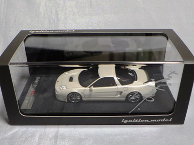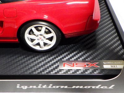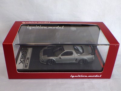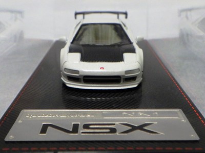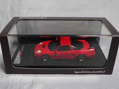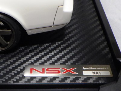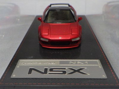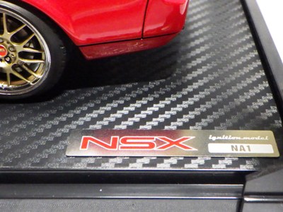 | 2017年5月28日(ヤフオクでは27日初登場)、イグニッションモデル初の1/43NSX5種(「IG0927NSX(NA1)レッド」「IG0928NSX(NA1)シルバー」「IG0929NSX(NA1)ホワイト(18inTE37タイプホイール)」「IG0930NSX(NA1)ホワイト(18inBBSタイプメッシュホイール)」「IG0934NSX(NA1)レッド・カーボンボンネット」が同時に発売された( 「IG0933NSX(NA1)ブルー」 「IG0932NSX(NA1)イエロー」 「IG0931NSX(NA1)ブラック」は6月23日発売)。墨入れが少々きつめで、フェンダーのエッジは立ちすぎだが、1/18で見せたクオリティの高さはそのまま。かつてない革張りの台座が何とも言えない高級感を醸し出している。生産台数150台。 | ||||||||||||||||||||||||||||||||||||||||||||||