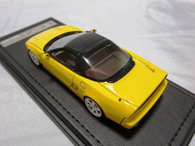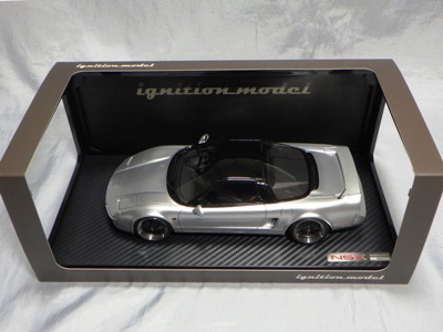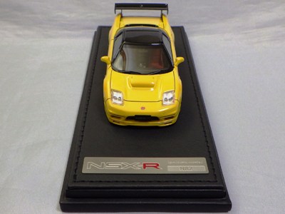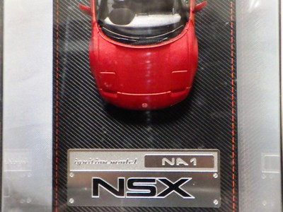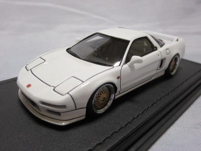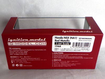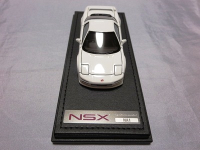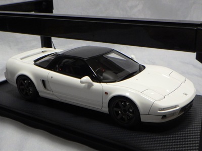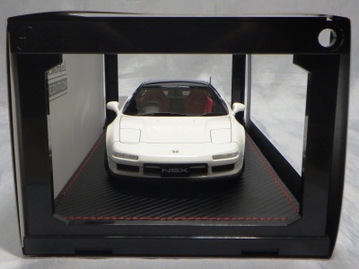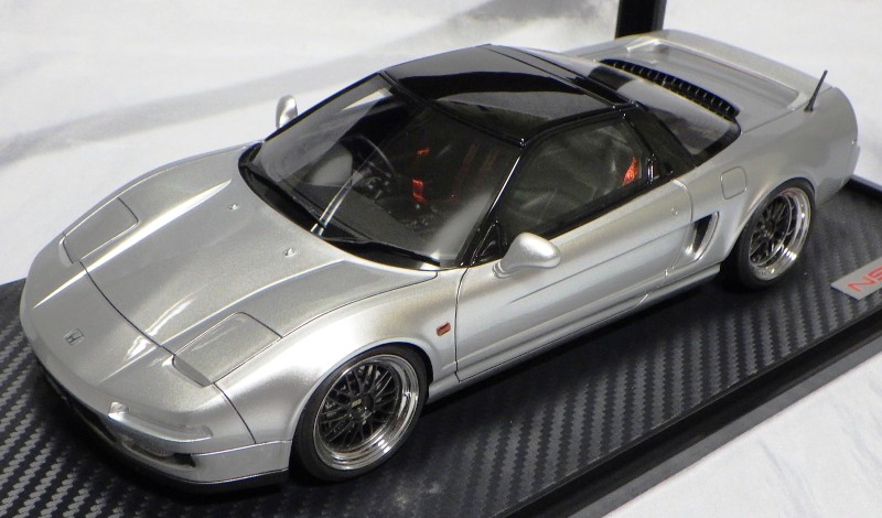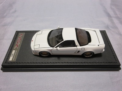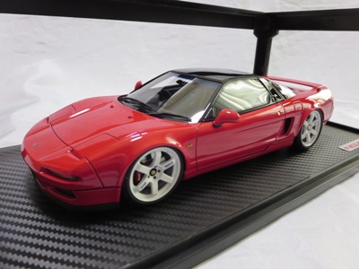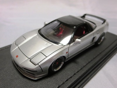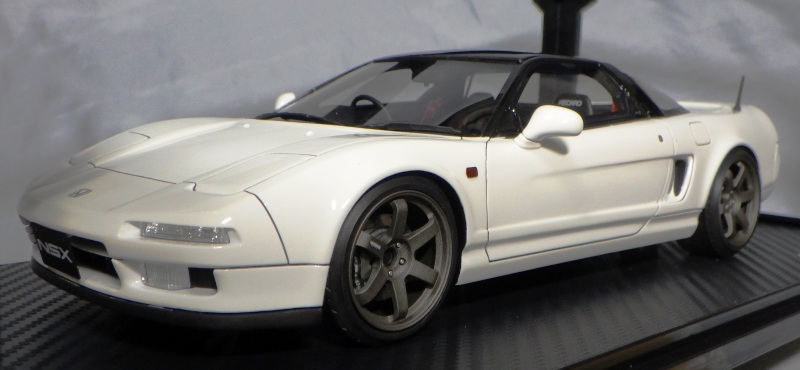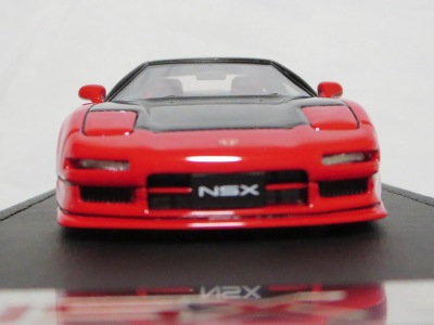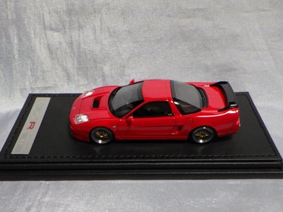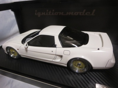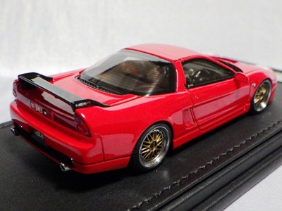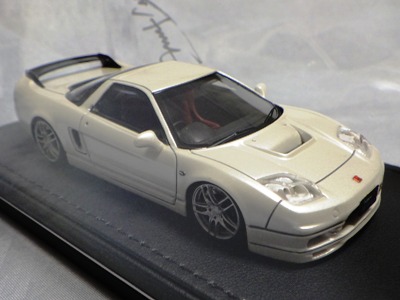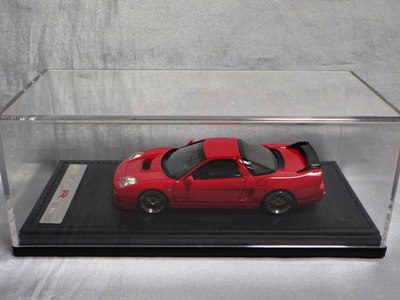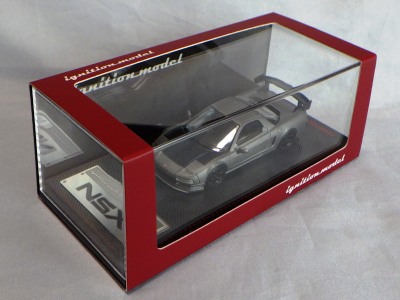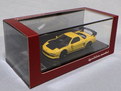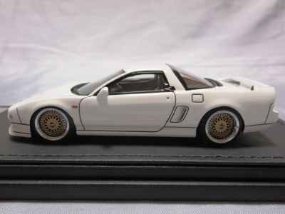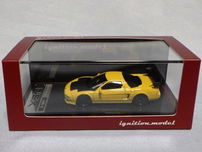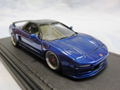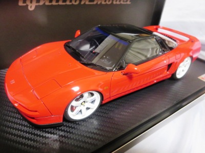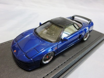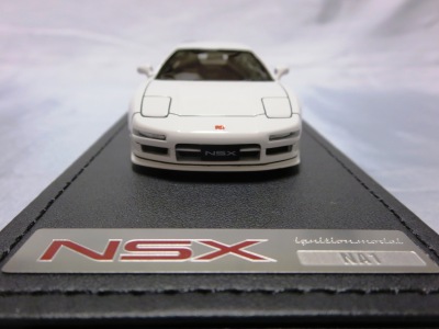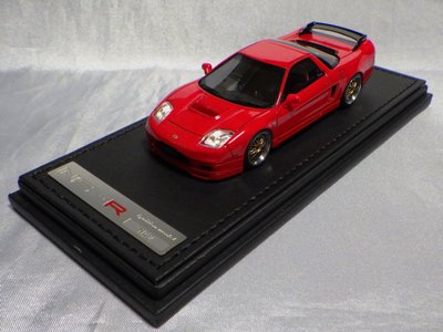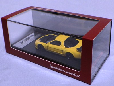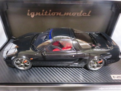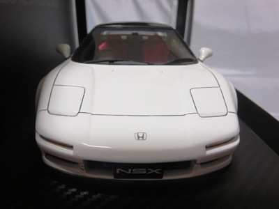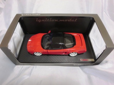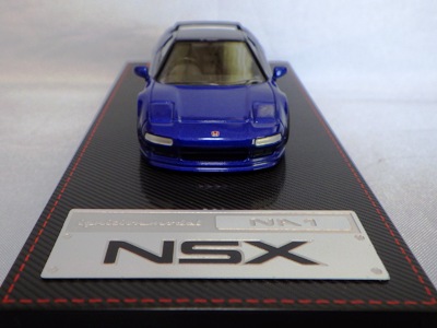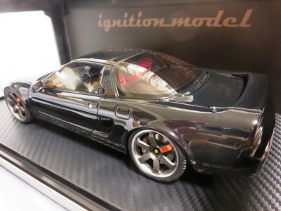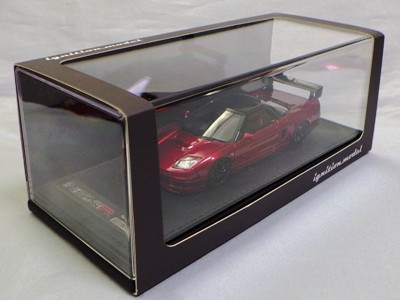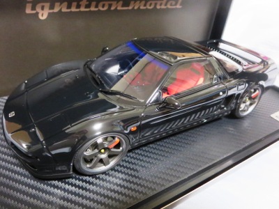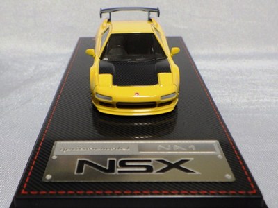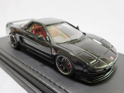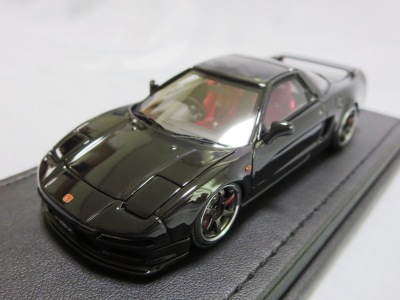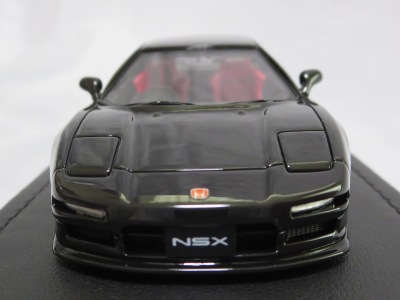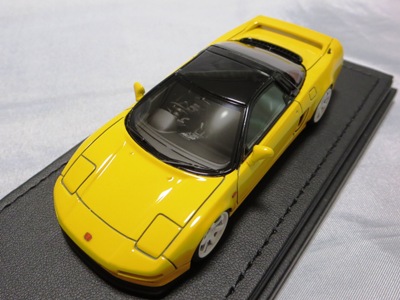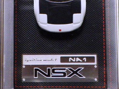 | 2017年5月28日(ヤフオクでは27日初登場)、イグニッションモデル初の1/43NSX5種(「IG0927NSX(NA1)レッド」「IG0928NSX(NA1)シルバー」「IG0929NSX(NA1)ホワイト(18inTE37タイプホイール)」「IG0930NSX(NA1)ホワイト(18inBBSタイプメッシュホイール)」「IG0934NSX(NA1)レッド・カーボンボンネット」が同時に発売された( 「IG0933NSX(NA1)ブルー」 「IG0932NSX(NA1)イエロー」 「IG0931NSX(NA1)ブラック」は6月23日発売)。墨入れが少々きつめで、フェンダーのエッジは立ちすぎだが、1/18で見せたクオリティの高さはそのまま。かつてない革張りの台座が何とも言えない高級感を醸し出している。生産台数150台。 | ||||||||||||||||||||||||||||||||||||||||||||||