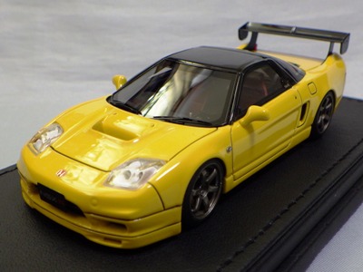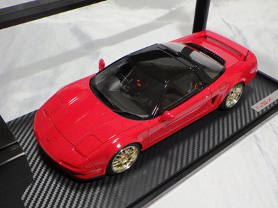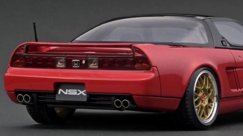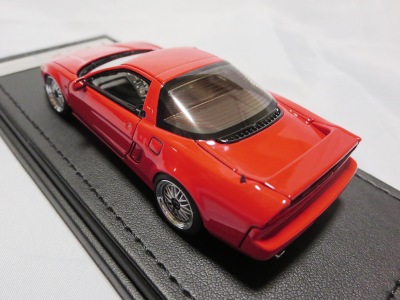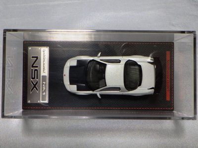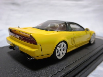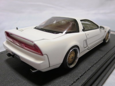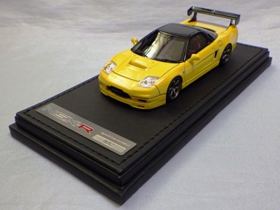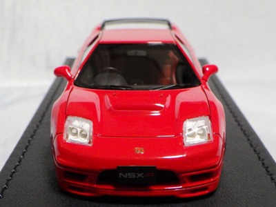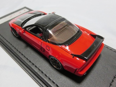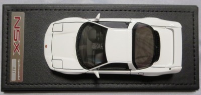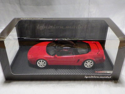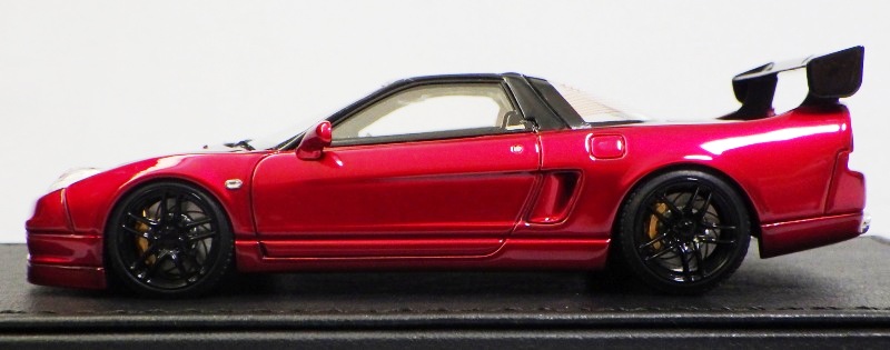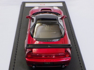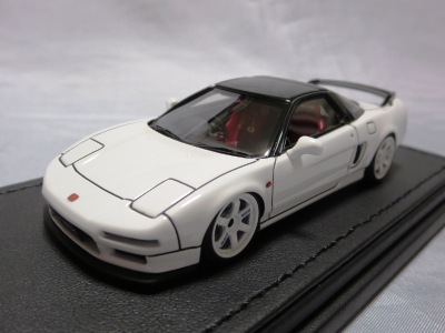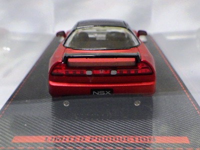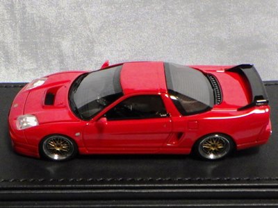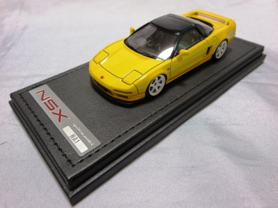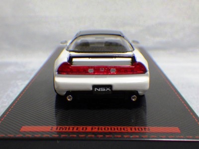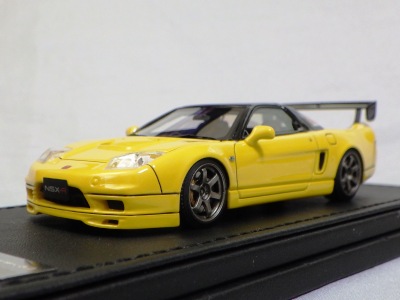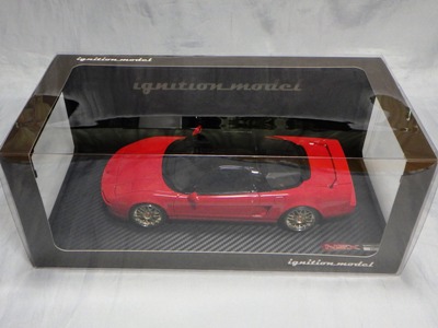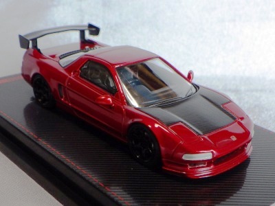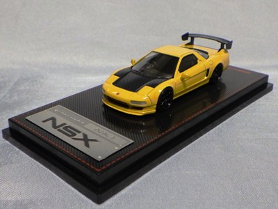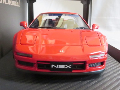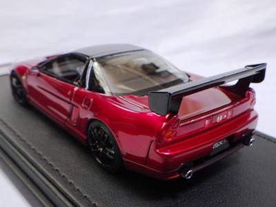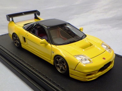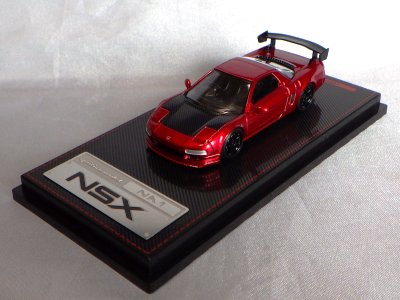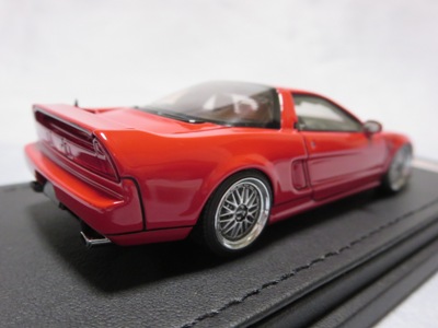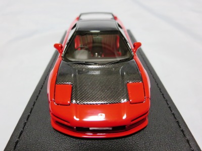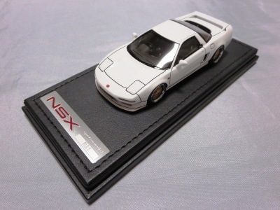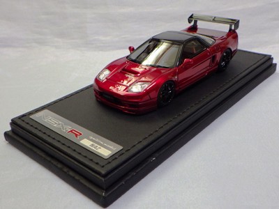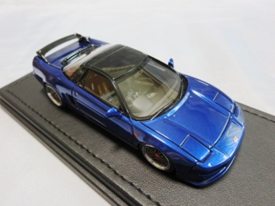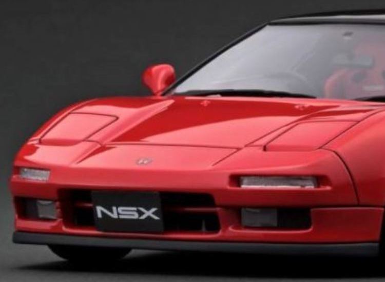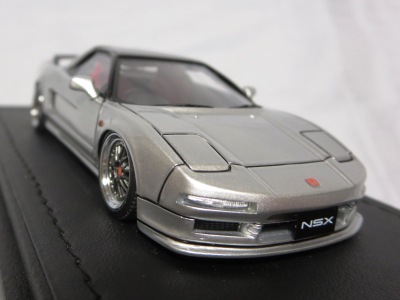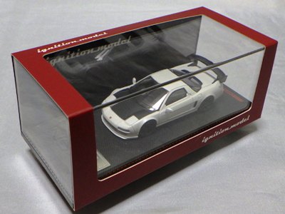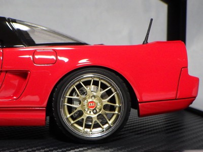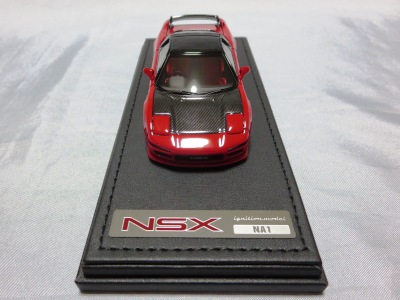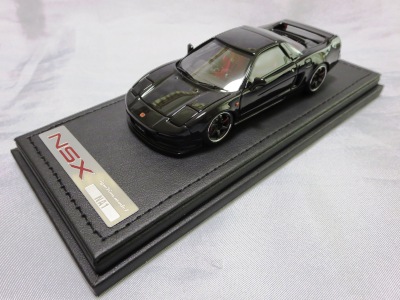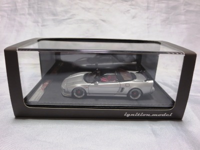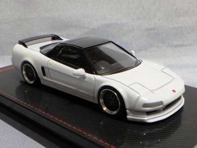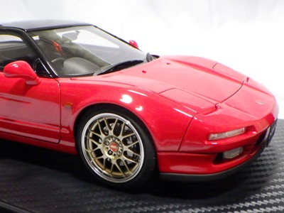 | 2017年5月28日(ヤフオクでは27日初登場)、イグニッションモデル初の1/43NSX5種(「IG0927NSX(NA1)レッド」「IG0928NSX(NA1)シルバー」「IG0929NSX(NA1)ホワイト(18inTE37タイプホイール)」「IG0930NSX(NA1)ホワイト(18inBBSタイプメッシュホイール)」「IG0934NSX(NA1)レッド・カーボンボンネット」が同時に発売された( 「IG0933NSX(NA1)ブルー」 「IG0932NSX(NA1)イエロー」 「IG0931NSX(NA1)ブラック」は6月23日発売)。墨入れが少々きつめで、フェンダーのエッジは立ちすぎだが、1/18で見せたクオリティの高さはそのまま。かつてない革張りの台座が何とも言えない高級感を醸し出している。生産台数150台。 | ||||||||||||||||||||||||||||||||||||||||||||||