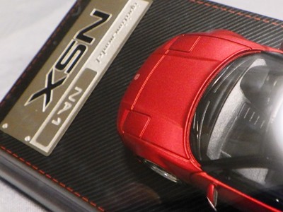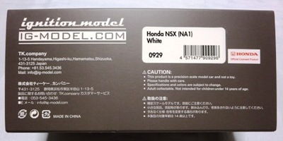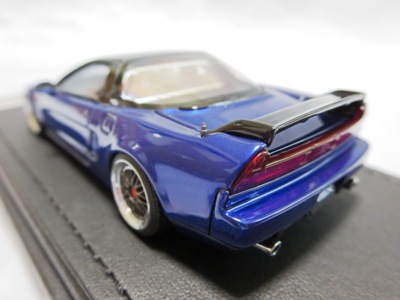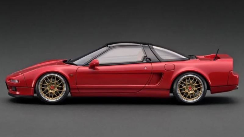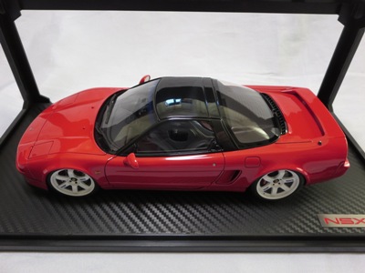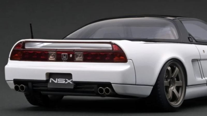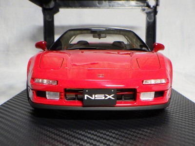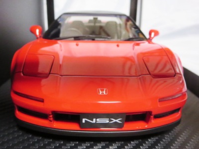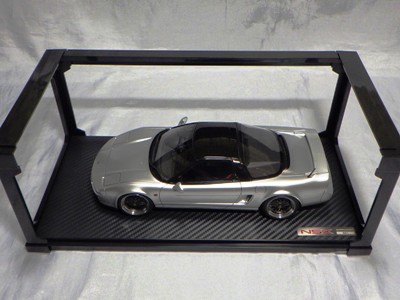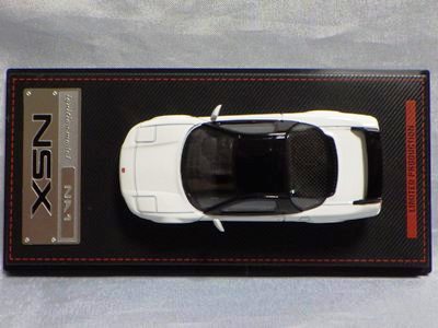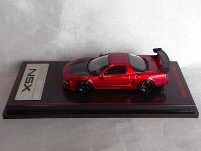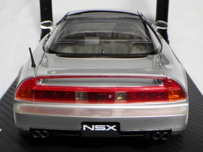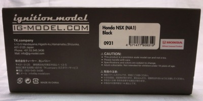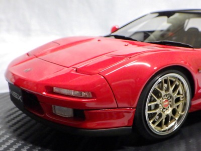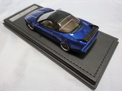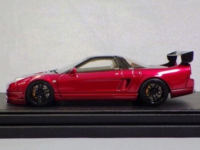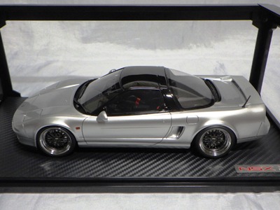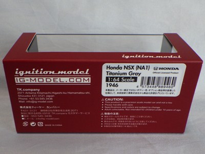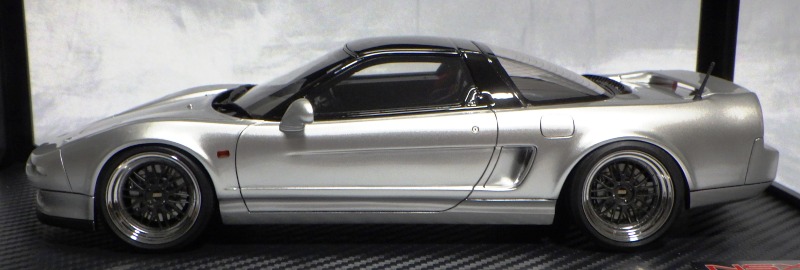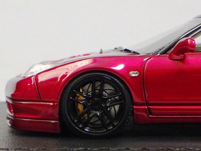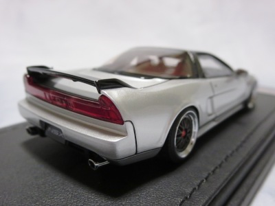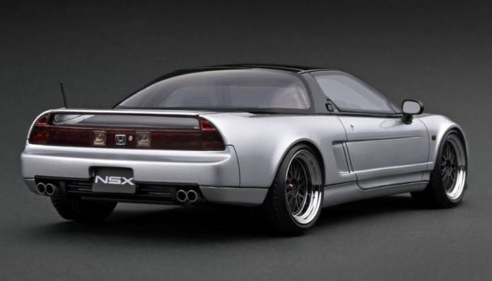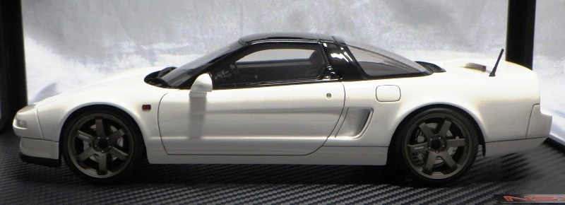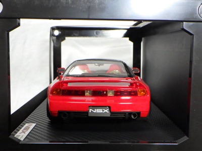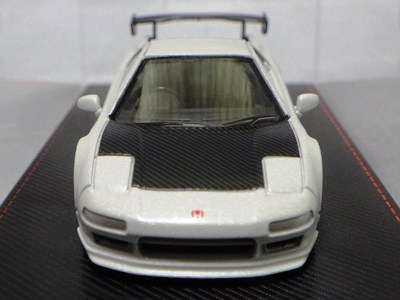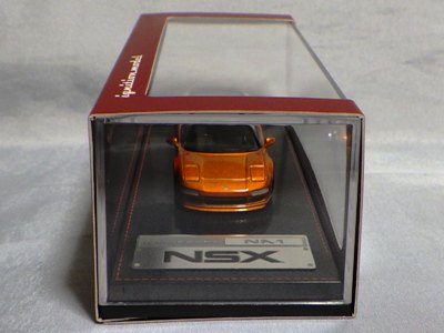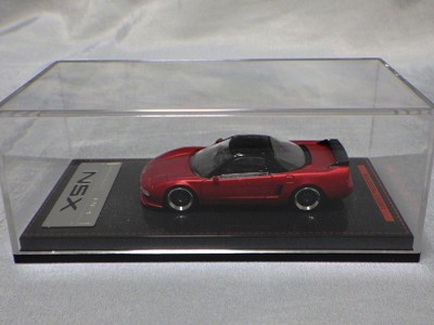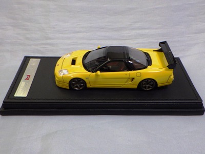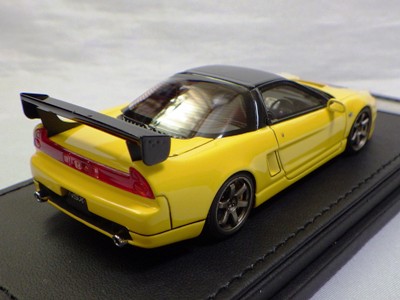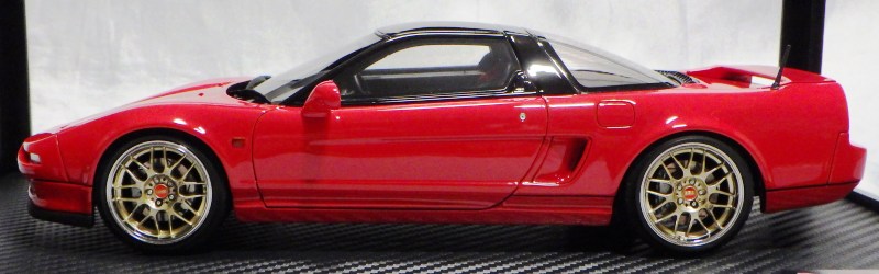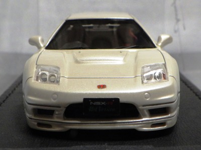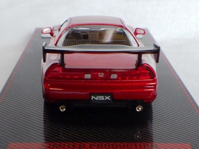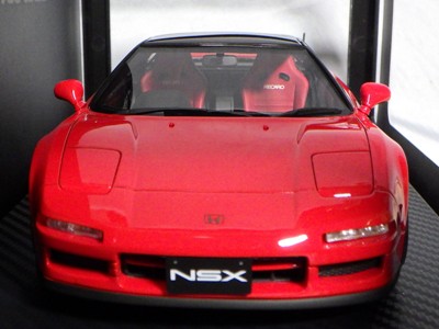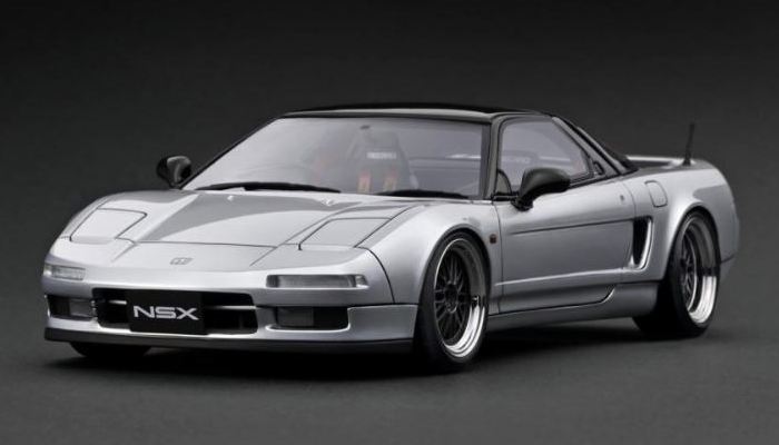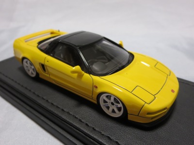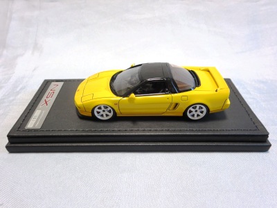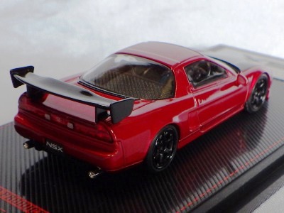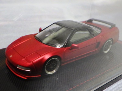 | 2017年5月28日(ヤフオクでは27日初登場)、イグニッションモデル初の1/43NSX5種(「IG0927NSX(NA1)レッド」「IG0928NSX(NA1)シルバー」「IG0929NSX(NA1)ホワイト(18inTE37タイプホイール)」「IG0930NSX(NA1)ホワイト(18inBBSタイプメッシュホイール)」「IG0934NSX(NA1)レッド・カーボンボンネット」が同時に発売された( 「IG0933NSX(NA1)ブルー」 「IG0932NSX(NA1)イエロー」 「IG0931NSX(NA1)ブラック」は6月23日発売)。墨入れが少々きつめで、フェンダーのエッジは立ちすぎだが、1/18で見せたクオリティの高さはそのまま。かつてない革張りの台座が何とも言えない高級感を醸し出している。生産台数150台。 | ||||||||||||||||||||||||||||||||||||||||||||||