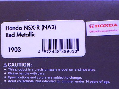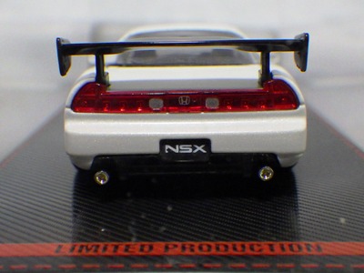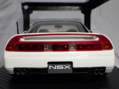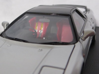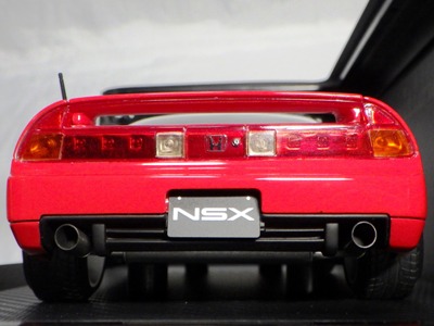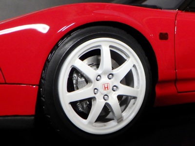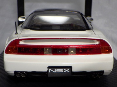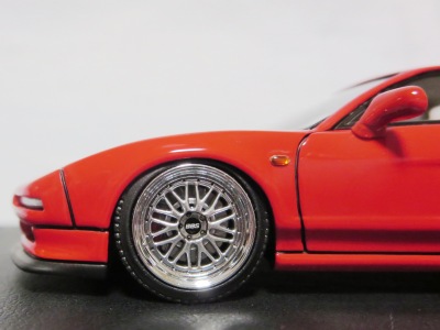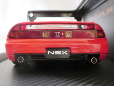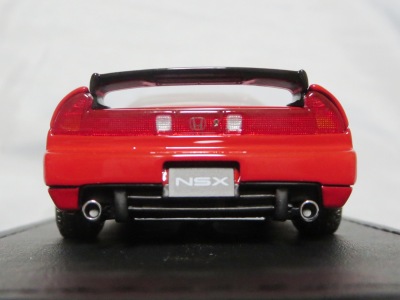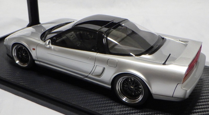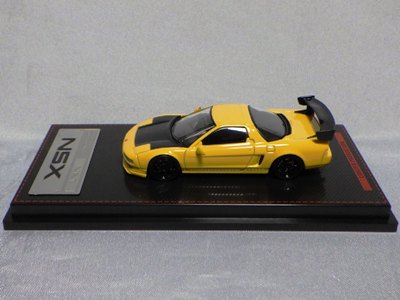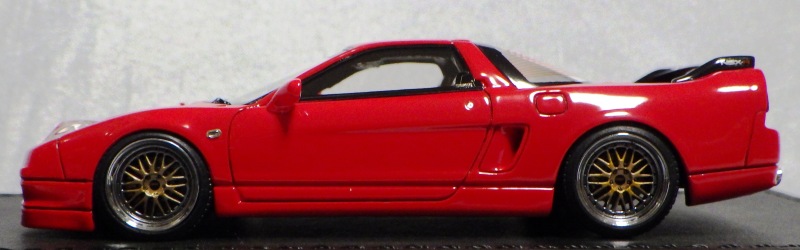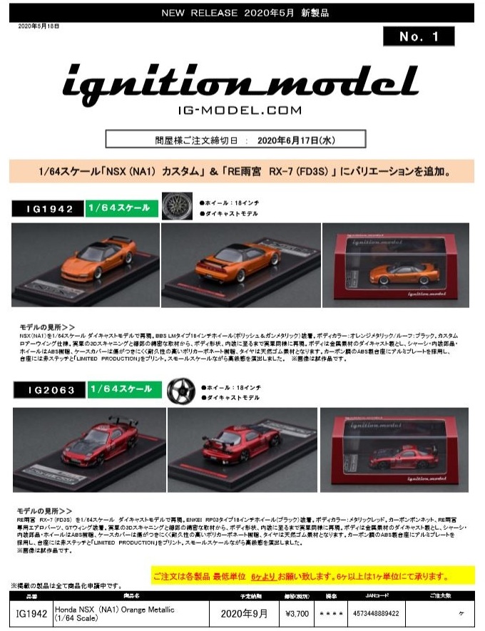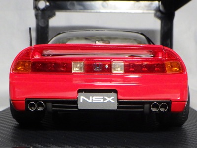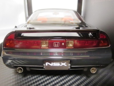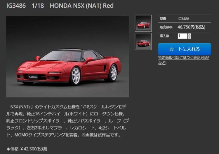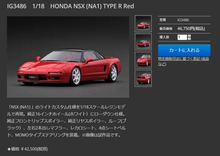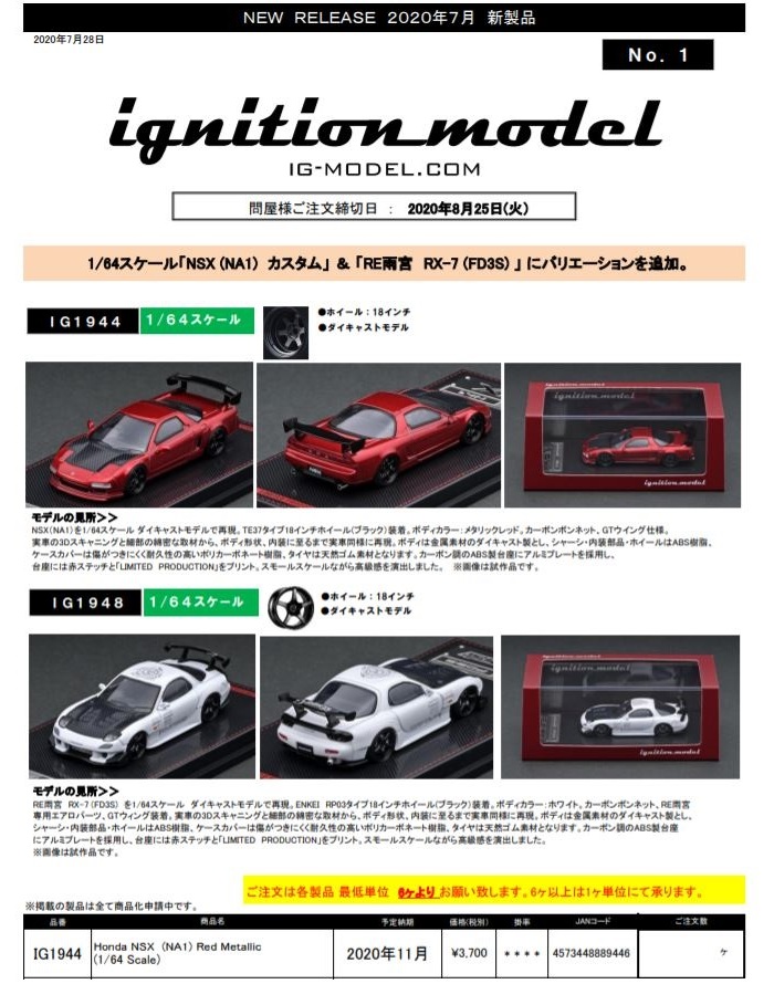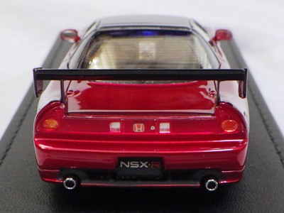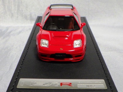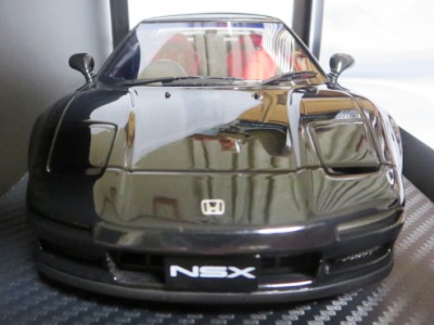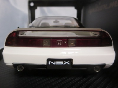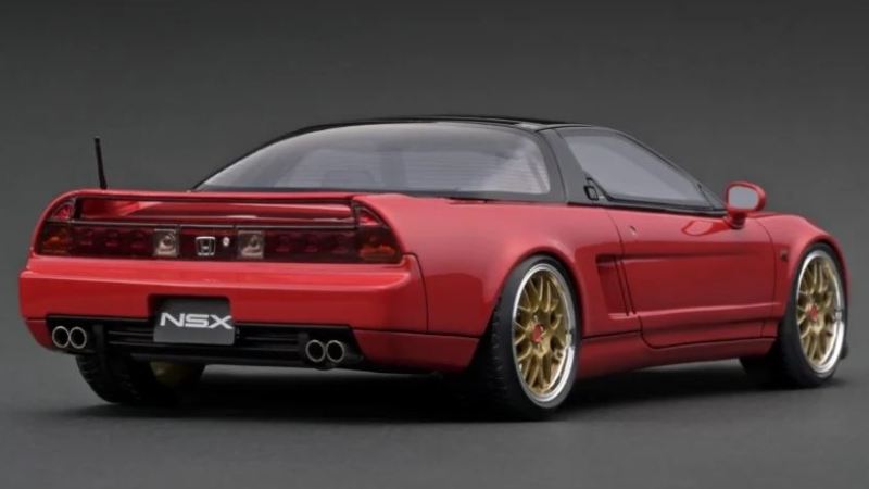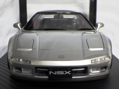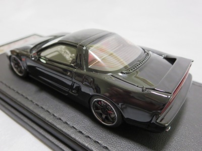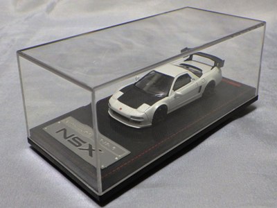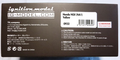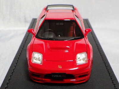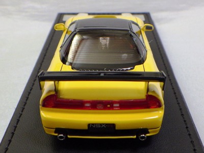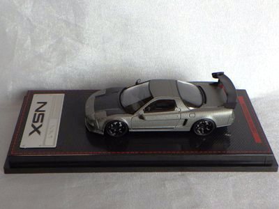 | 2017年5月28日(ヤフオクでは27日初登場)、イグニッションモデル初の1/43NSX5種(「IG0927NSX(NA1)レッド」「IG0928NSX(NA1)シルバー」「IG0929NSX(NA1)ホワイト(18inTE37タイプホイール)」「IG0930NSX(NA1)ホワイト(18inBBSタイプメッシュホイール)」「IG0934NSX(NA1)レッド・カーボンボンネット」が同時に発売された( 「IG0933NSX(NA1)ブルー」 「IG0932NSX(NA1)イエロー」 「IG0931NSX(NA1)ブラック」は6月23日発売)。墨入れが少々きつめで、フェンダーのエッジは立ちすぎだが、1/18で見せたクオリティの高さはそのまま。かつてない革張りの台座が何とも言えない高級感を醸し出している。生産台数150台。 | ||||||||||||||||||||||||||||||||||||||||||||||
