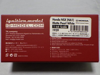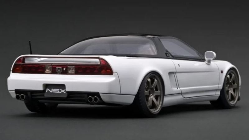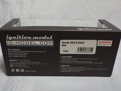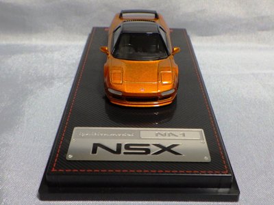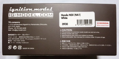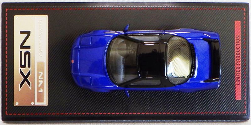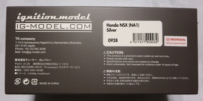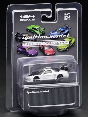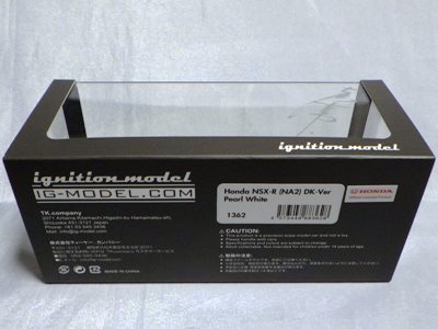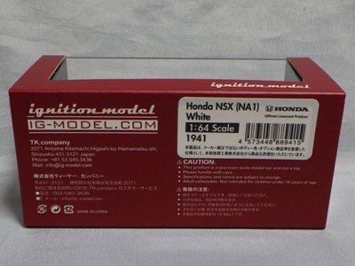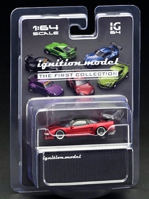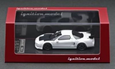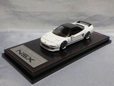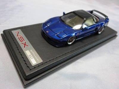 | 2017年5月28日(ヤフオクでは27日初登場)、イグニッションモデル初の1/43NSX5種(「IG0927NSX(NA1)レッド」「IG0928NSX(NA1)シルバー」「IG0929NSX(NA1)ホワイト(18inTE37タイプホイール)」「IG0930NSX(NA1)ホワイト(18inBBSタイプメッシュホイール)」「IG0934NSX(NA1)レッド・カーボンボンネット」が同時に発売された (「IG0933NSX(NA1)ブルー」 「IG0932NSX(NA1)イエロー」 「IG0931NSX(NA1)ブラック」は6月23日発売)。墨入れが少々きつめで、フェンダーのエッジは立ちすぎだが、1/18で見せたクオリティの高さはそのまま。かつてない革張りの台座が何とも言えない高級感を醸し出している。生産台数160台。 | ||||||||||||||||||||||||||||||||||||||||||||||
