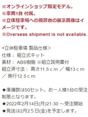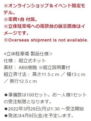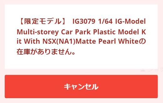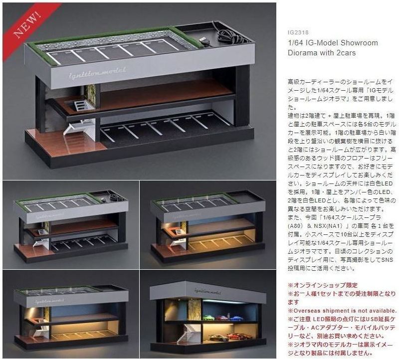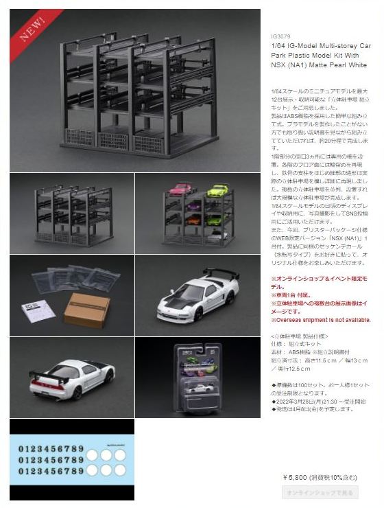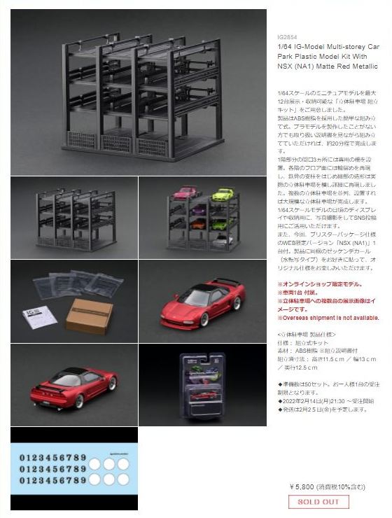 2022年2月25日発売の1/64「IG2854 IG-Model Multi-storey Car Park Plastic Model Kit With NSX(NA1)Matte Red Metallic」は、2020年12月17日発売のIG1938をブリスターパック仕様にしたものに、立体駐車場の組み立てキットが付属したもので、オンラインショップで限定販売され、50セットが一瞬で完売した。 |