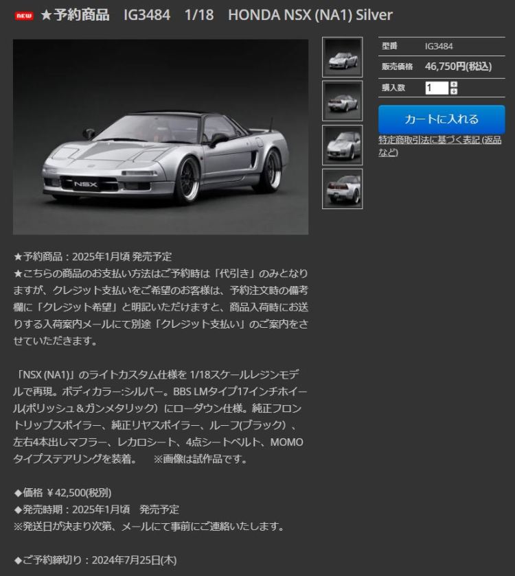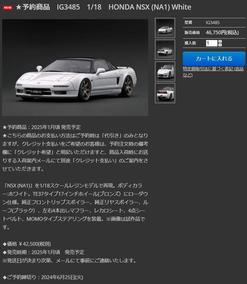 2024年5月28日にレッドとホワイトの2種、6月28日にシルバーとレッドの2種の受注が開始され、2024年11月15日に4種同時に発売された。これは、6月に受注が開始された方のレッドモデル。 この商品は、5月に先に受注が開始されていたIG3483と商品名は同じだが、IG3483がゴールドのBBS RG-Rホイールであるのに対し、IG3486はホワイトのNSX-R純正のオプションホイールになっているなど、いくつかの相違点がある。 普通に考えればI、「G3486はNSX-R仕様にカスタムされたNSXクーペ」ということだと思われるのだが、受注開始時より、イグニッションモデル公式サイトの商品ラインナップのページでは「NSX」、オンラインショップのページでは「NSX-R」という謎の表示がされていた。 商品名の記載ミスかとも思われたが、それぞれのページに掲載されているミニカー画像のナンバープレートにも、「NSX」「NSX-R」と別々のプリントがされていた。 商品発売後の2024年12月21日現在も差し替えはなく、そのまま2種類の画像が同時に掲載されている。 今回ショップから届いた実物の商品名は「NSX」で、ナンバープレートも「NSX」であることを確認したが、もしかすると同じ品番で「NSX-R」も存在しているのかもしれない。 クレーマーだと思われたくないので、メーカーやショップに問い合わせをしたことはこれまでほとんどないのだが、久しぶりに問い合わせメールを送ってみたので、もしお返事を頂けたらご紹介する。 なお、2種類の画像では、どちらにも実際のNSX-Rには装着されていないフォグランプが装着されていたが、届いた商品には実車同様に装着されておらず、実車同様のメッシュ仕様になっており、実際のNSX-Rにより近づいている。 |