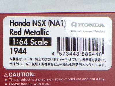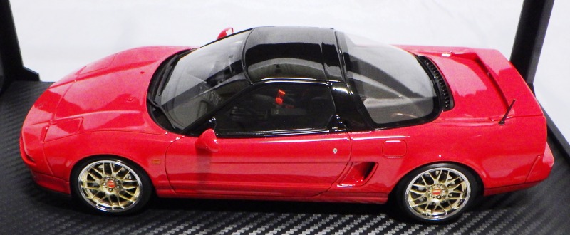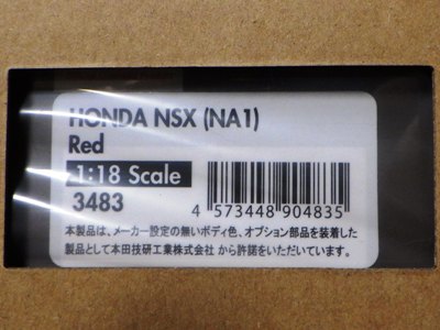 イグニッションモデル初のNSXミニカーとして2016年4月にIGN405ブラックと共に発売予定だったIG0400レッドが、402シルバーと403ホワイトに遅れて3番手として登場。2016年8月23日にメーカーから問屋へ向けて出荷され、メーカーとしては店頭で26日発売を予定していたようだが、25日にはヤフオクでの出品がスタート。Amazonに注文していた自分の所には27日の午前中に届く。生産台数180台(ショップによって200台と記載されている場合も)。ゴールドのBBS LM18インチホイールが印象的な1台。 |