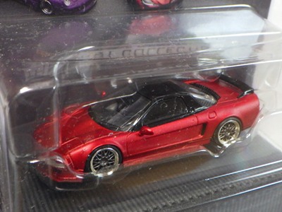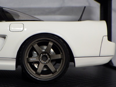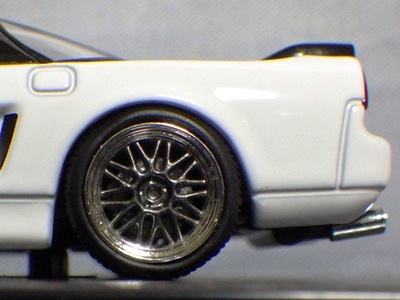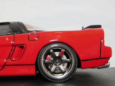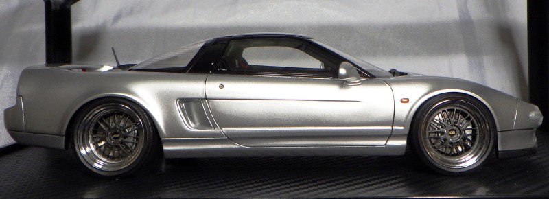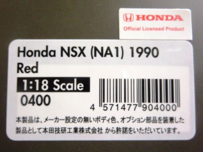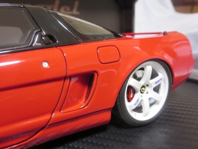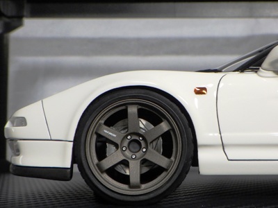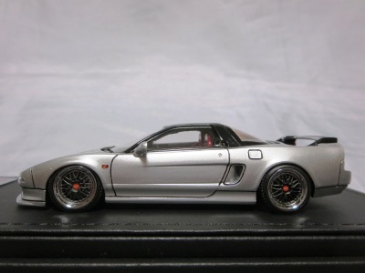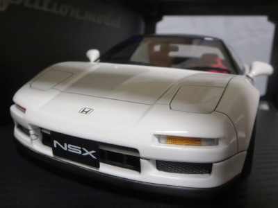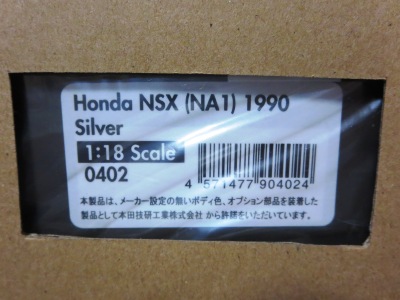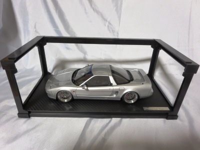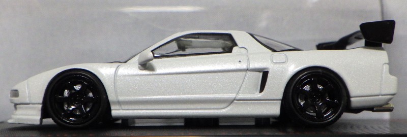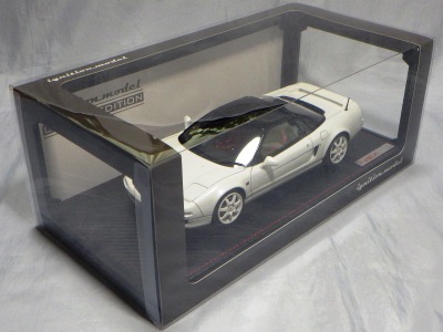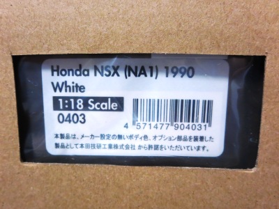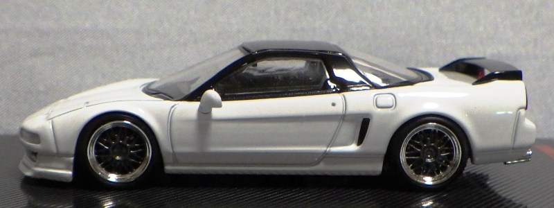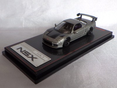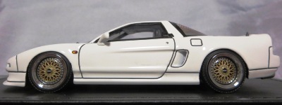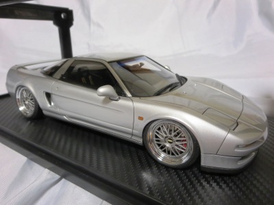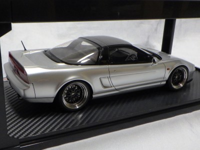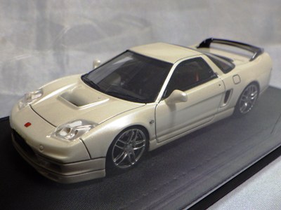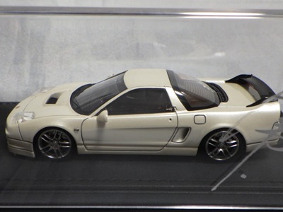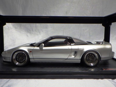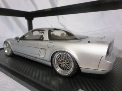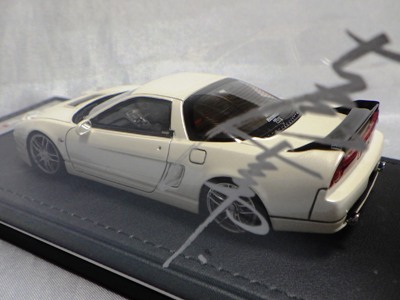 当初NSXのモデルは、2016年4月に400レッド、405ブラック、5月に402シルバー、403ホワイト、6月に401レッド、404ホワイトを発売することを発表していたが、7月29日にやっと402シルバー、403ホワイトの2種が発売された。 1/18のカスタムNSXと言えば、2003年から2004年にかけてFUNLINEがマッスルマシーンシリーズで派手なストリートチューニングカーをリリースしていたが、このシリーズはライトでシックなドレスアップがポイントとなっている。 実際近年オートアートや京商の1/18モデルを個人がカスタムしたものがヤフオクに数多く出品されて人気があり、目の付け所はなかなかである。 前述したマッスルマシーンは玩具的な色合いが強かったが、本シリーズは開閉ギミックを一切廃し、プロポーション重視としており、それだけに非常にハイクオリティーで、芸術的な仕上がりである。カスタムカーにありがちな下品さがなく、むしろノーマルに負けない上品な雰囲気を醸し出している。生産台数160台。 |