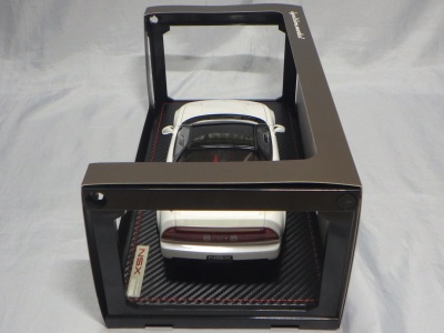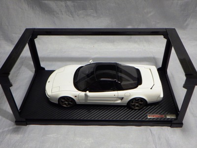 2024年12月21日にイグニッションモデルから届いたメルマガでその存在が明らかになった限定モデル1/18「IG3487 HONDA NSX (NA1)Pearl White」。翌22日に静岡県浜松市で開催された「第11回 MINICAR GET★YOU (ミニカーゲッチュー)」で販売されることが告知された。この商品には専用アクリルケースが付属し、車両のディスプレイ台座に設置されているフレームを外し、付属のアクリルカバーを設置すれば透明度が高い高級感のあるディスプレイを楽しめるというもの。車両+ケースのセットで45,000円(税込)というお買い得な価格(500円OFF)を設定。しかも会場販売分はイベント限定パッケージ仕様。さすがに静岡まで行く余裕はないため、同時に告知されていたオンライン販売に期待していたのだが、2月7日〜9日にインテックス大阪で開催された「大阪オートメッセ2025」でも販売され、完売してしまうのではとヒヤヒヤしていた。 そして2月13日、ついにオンライン販売の受注日時が「2月17日(月)21時30分(2月28日一斉発送)」と発表され、当時は1日で完売したが、なんとか無事注文することができた(50台限定で一人2台までと)。 ちなみにミニカーの方は、レジン製で純正16インチホイールに程よいローダウン仕様。純正フロントリップスポイラー、純正リヤスポイラー、ルーフ(ブラック)、左右2本出しマフラー、レカロシート(レッド)、4点シートベルト、MOMOタイプステアリングを装着。台座の座面はカーボン調の素材を採用し、レッドのステッチをあしらっている。 予定通り2月28日に購入者に発送され、3月1日に自宅にも届いた。商品はイグニッションモデルの段ボール箱に入って送られてきたが、セット専用のパッケージが存在するわけではなく、ミニカーとクリアケースのパッケージが、段ボール箱に並べて入っているだけ。クリアケースの方は専用の段ボールパッケージで厳重にパックされていたので、あえて開封せずパッケージのみ撮影したのみ。 ミニカーの方は通常品と同様のパッケージングで、こちらは容易に開封が可能。紙製の箱を開封すると、ビニール袋に包まれた箱状のクリアケース(PET/PP/PCVの識別が今ひとつ分かりません)が出てくる。この樹脂製のクリアケースがペラペラなため、展示するためには今回のセットに付属するようなアクリル製のハードタイプのクリアケースが必要になるわけである。このソフトタイプのケースを外すと台座に固定されたプラ製のフレームに紙製のカバーをかけたものが登場。今回はこの段階で撮影しています。カーボン調の素材を採用し、レッドのステッチが入っている台座は高い高級感を出している。 |