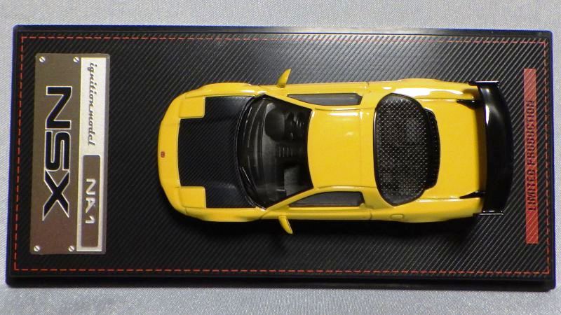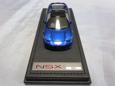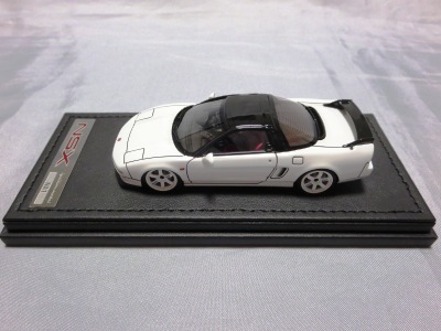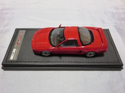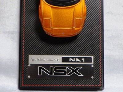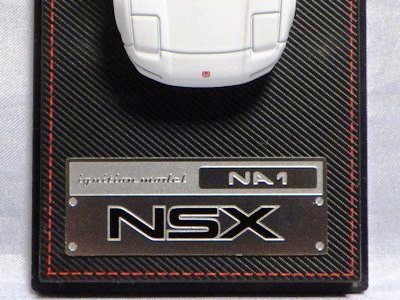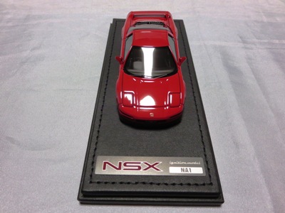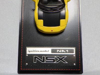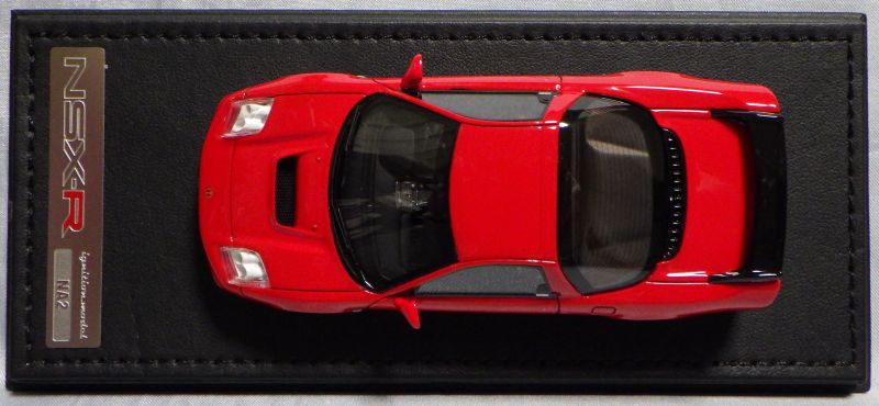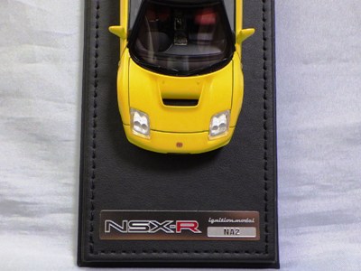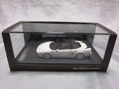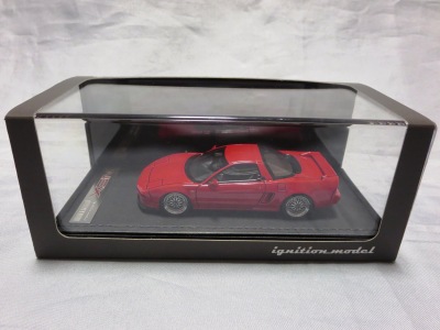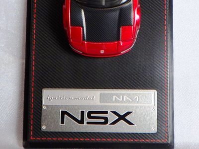 | 2017年5月28日(ヤフオクでは27日初登場)、イグニッションモデル初の1/43NSX5種(「IG0927NSX(NA1)レッド」「IG0928NSX(NA1)シルバー」「IG0929NSX(NA1)ホワイト(18inTE37タイプホイール)」「IG0930NSX(NA1)ホワイト(18inBBSタイプメッシュホイール)」「IG0934NSX(NA1)レッド・カーボンボンネット」が同時に発売された (「IG0933NSX(NA1)ブルー」 「IG0932NSX(NA1)イエロー」 「IG0931NSX(NA1)ブラック」は6月23日発売)。墨入れが少々きつめで、フェンダーのエッジは立ちすぎだが、1/18で見せたクオリティの高さはそのまま。かつてない革張りの台座が何とも言えない高級感を醸し出している。 | ||||||||||||||||||||||||||||||||||||||||||||||