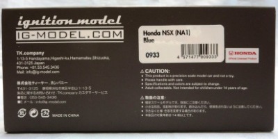 2017年5月28日(ヤフオクでは27日初登場)、イグニッションモデル初の1/43NSX5種(「IG0927NSX(NA1)レッド」「IG0928NSX(NA1)シルバー」「IG0929NSX(NA1)ホワイト(18inTE37タイプホイール)」「IG0930NSX(NA1)ホワイト(18inBBSタイプメッシュホイール)」「IG0934NSX(NA1)レッド・カーボンボンネット」が同時に発売された(「IG0933NSX(NA1)ブルー」「IG0932NSX(NA1)イエロー」「IG0931NSX(NA1)ブラック」は6月23日発売)。 墨入れが少々きつめで、フェンダーのエッジは立ちすぎだが、1/18で見せたクオリティの高さはそのまま。かつてない革張りの台座が何とも言えない高級感を醸し出している。 |