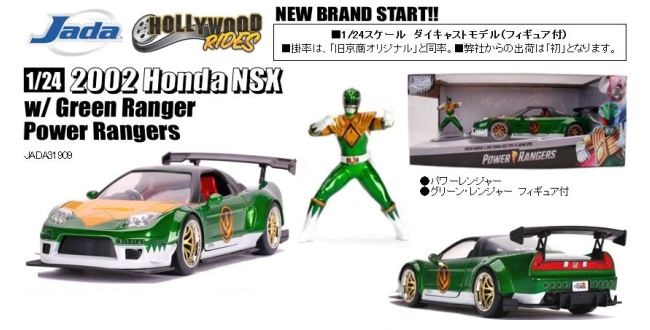 2020年7月10日、JADATOYSのニュースがもう1件。1/24「JADA31909ハリウッドライド・ホンダNSX2002グリーン・レンジャーフィギュア付(パワーレンジャー)」の受注開始。ダイキャスト製で発売は9月下旬。定価は4,980円(税別)。