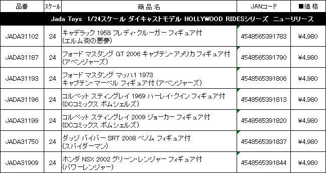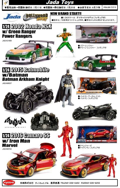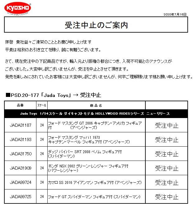 7月10日に受注開始の情報を掲載したばかりの1/24「JADA31909ハリウッドライド・ホンダNSX2002グリーン・レンジャーフィギュア付(パワーレンジャー)」だが、版権の問題で、1週間もたたない7月16日に発売中止が発表された。シリーズ10種中6種が引っかかり、運悪くNSXがその中に含まれていた。