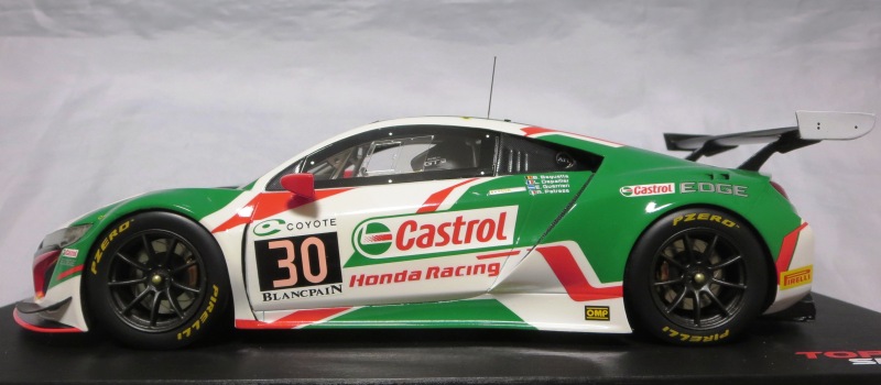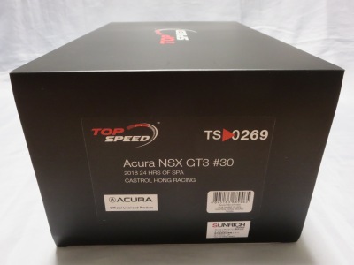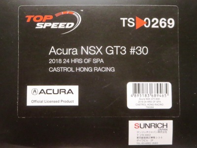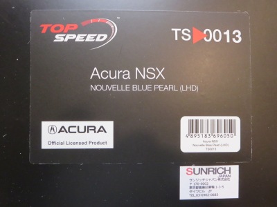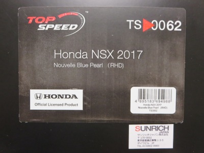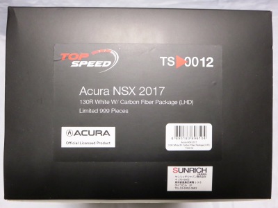 | 2017年10月28日発売。9月30日に発売予定であったが1か月遅れての発売となった。ホンダ仕様のTS0064(RHD)も同時発売のはずで、両方注文したAmazonでも発売日が同じように表記されているが、なぜかアキュラ仕様の方しか発送されてこなかった。 999台限定と特にうたってはおらず、パッケージにもそのような記述はないが、助手席側の車体下面にはシリアルナンバープレートがTS0001や0002、0012のように設置されており、購入したものには40番台のナンバーが刻まれていた。 |