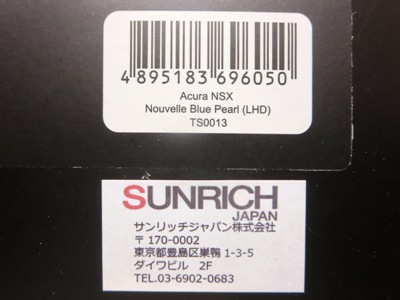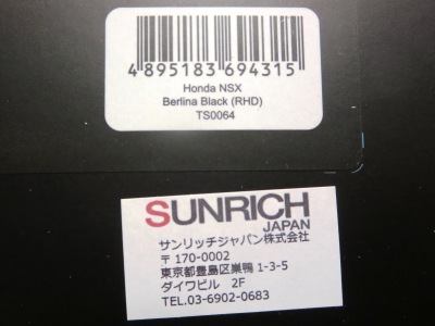 | 2015年12月23日に注文してあったショップ「minicar CHOICE」Amazon店から届く。その時点でのヤフオクへの登場はなかったが、1月に入ってからTS0001のアキュラ仕様と合わせて数台が出品された。国内ではTS0001と共に12月16日に発売されたものと思われる。梱包状態はTS0001と全く同じ。TS0001との違いはエンブレムがアキュラからホンダに変更されている点のみ。塗装面に擦れたような跡は全く見られなかったが、リアバンパー内のメッシュパーツが一部脱落しており自分で修理。助手席側のボディ下部のシリアルナンバープレートのナンバーは「22X/999」。 | |