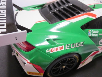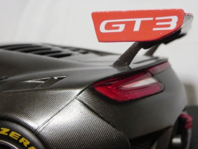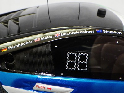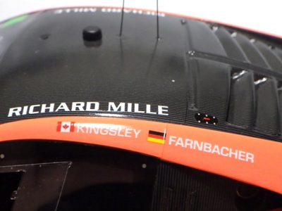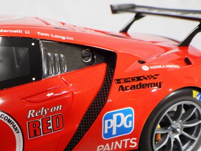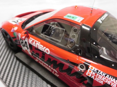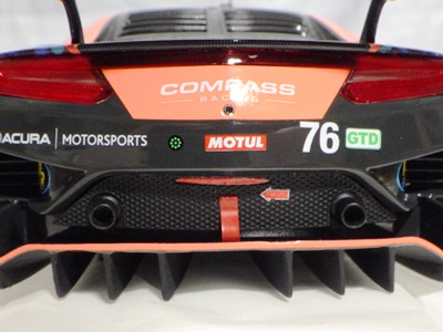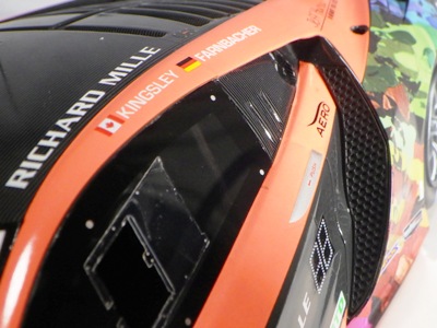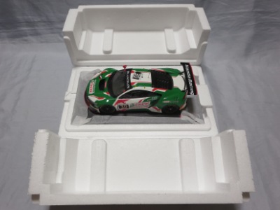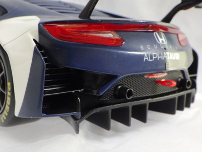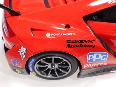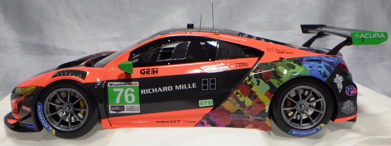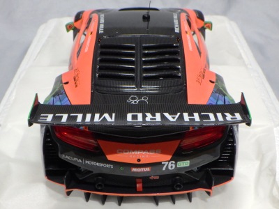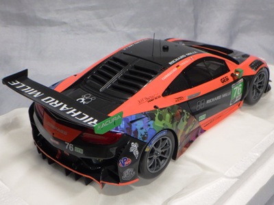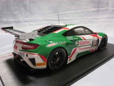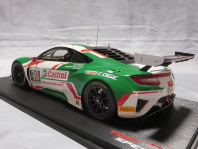 とともに受注が開始され、2019年9月13日に1/43モデル4種と同時に発売された。 TSMが派手なカラーリングの新型NSXレースカーを1/18でリリースするのはこれが初(プレゼンテーション2017モデルを除く)。 助手席下部にシリアルナンバープレートらしきものが見えるが、車高が低すぎて、薄い鏡を差し入れても番号が確認できない。 |