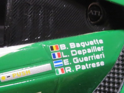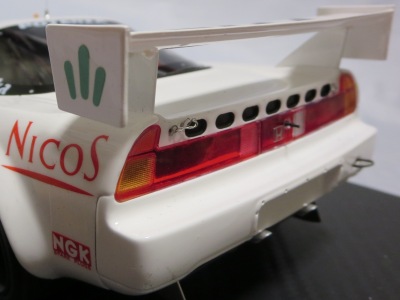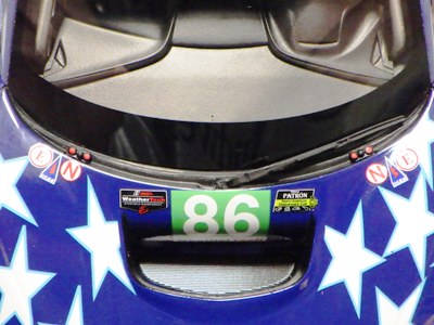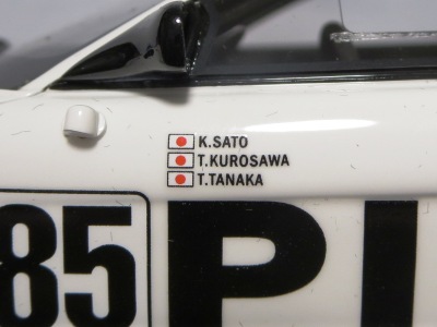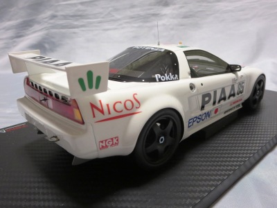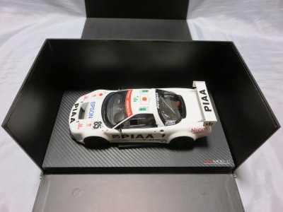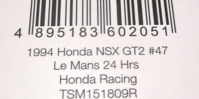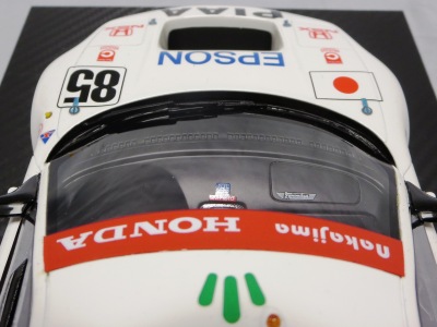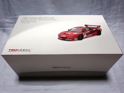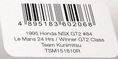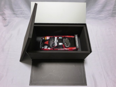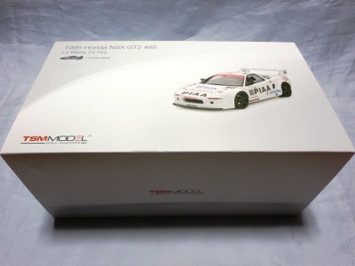 2017年8月31日に発売された「TSM151810R ホンダNSX GT2 #84 チーム国光1995ルマン24時間GT2クラス優勝車」「TSM151809R ホンダNSX GT2 #47ホンダレーシング1994ルマン24時間」の2種から遅れること4か月後の12月28日についに発売(11月30日に発売された1/43からも1か月遅れとなった)。この2種同様に1/18ながら「トップスピード」ブランドではない。 この1995年のルマンの85号車がモデル化されたのは、先の1/43を除いて完成品としては過去になく、2007年にスタジオ27から発売された1/24のガレージキットくらいしか存在していなかった。 ボディ下部に保護用のウレタンパッドがしっかりはまっているため、裏面のシリアルナンバープレートの有無は確認できない。 |