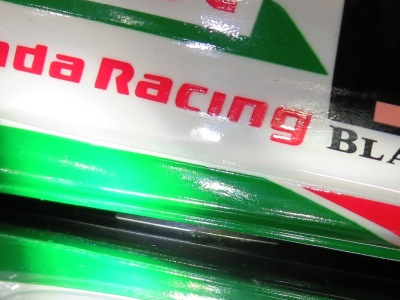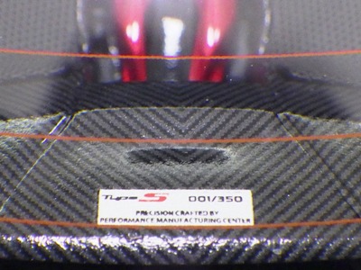 | 2017年5月31日発売。2016年10月に予約が開始され2017年1月にホンダバージョンと同時に発売予定であったが発売が延期されていた。 アキュラバージョンが先に発売され、ホンダバージョンはまた延期になったと思っていたのだが、同時に発売されていたらしいことが12月に分かり購入。 こちらも999台限定で、TS0001や0002のように車体下面にシリアルナンバープレートがあり、入手したモデルは170番台であった(下の画像は運転席下部に鏡を差し入れてプレートを映したもの。分母の「/999」の文字が確認できる)。 |