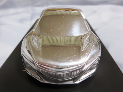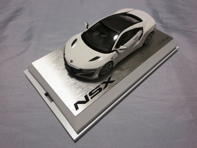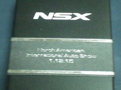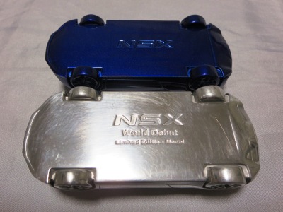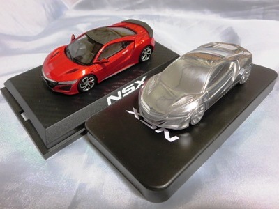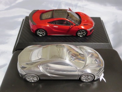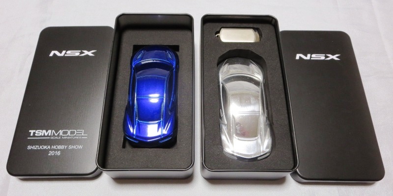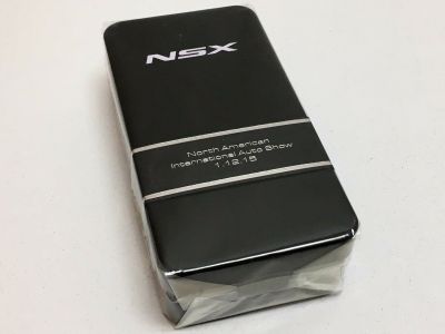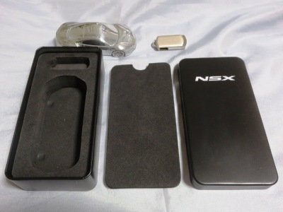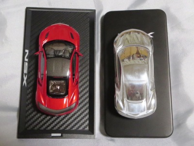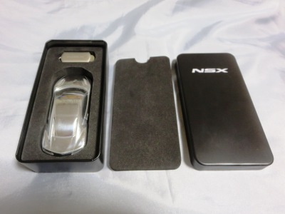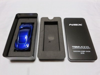 ツインメッセ静岡にて開催された静岡ホビーショー2016にて、一定数の注文を入れた業者にインセンティブモデルとして配布されたと思われるペーパーウエイト。 過去に一度ヤフオクに出品され、その時は落札できなかったが、2017年11月10日に久々に出品されたものを落札(11月12日にも続けて別の出品者からも出品された)。 北米国際オートショー(デトロイトショー)2015でプレスに配布されたインゴットモデルと同じ型を用いたモデルで、ケースの形状も同じ(中のウレタンの形状はUSBが付属していないため異なる)。 アメリカのアキュラディーラーで40ドルで販売されているNSX純正グッズNo.28のペーパーウエイトも同じメタリックブルーで、その流用と思われる。 |