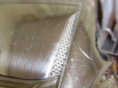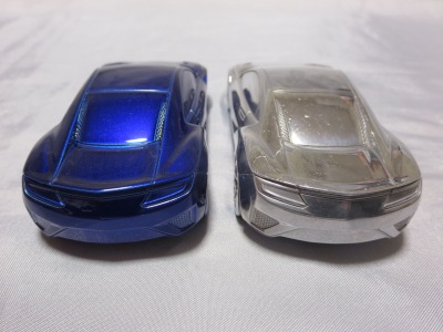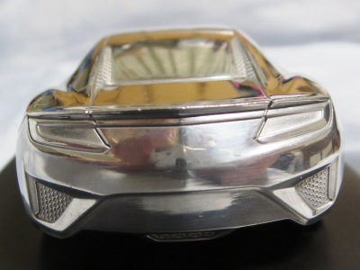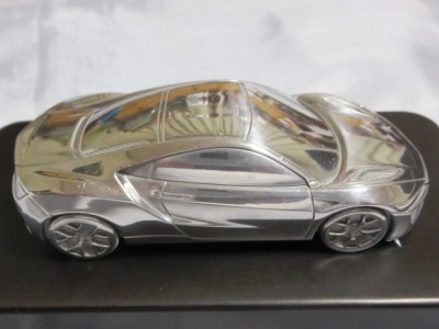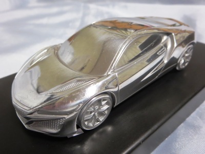 | 2015年1月12〜25日に開催された北米国際オートショー(デトロイトショー)2015でプレスに配付されたもの。ヤフオクには2015年10月と2016年10月、11月に計3点出品され、その3点目を入手。ミニカー自体は、アキュラのHPに掲載されている公式グッズNo.28のペーパーウエイト($40)とケースも同じもののようだが、ミニカーのカラーは公式グッズの方はクリアブルーで塗装されているようだ。重量は約194g、全長は約10.1cmで、サイズ的には1/43ミニカーとほぼ同じ。 ちなみに付属のUSBメモリは約25g、ケースは約101gで、ミニカーとの合計は約320g。下の画像のようにホンダのTSM製1/43ミニチュアカーと並べてみるとサイズがほぼ同じなのが分かる。アキュラとホンダの両エリアで共用するためかエンブレムはモールドされていない。ペーパーウエイトとは思えないくらいモールドは細かく高いクオリティーだが、さすがにドアミラーは再現されていない。リアガラス両サイドには、ダクトっぽい謎のモールドがある。NSXコンセプトにはこのようなダクトは確かにあったが、それはリアトランクにまで続くデザインで、デトロイトショーモデルではなくなったはずだが…。裏面には、「NSX World Debut Limited Edition Model」という刻印が入っている。缶ケースを空けると、ウレタン製の中蓋と中敷きが付属している。付属のUSBメモリの容量は8GBで、下に紹介したような14枚の画像が収められている。 | |