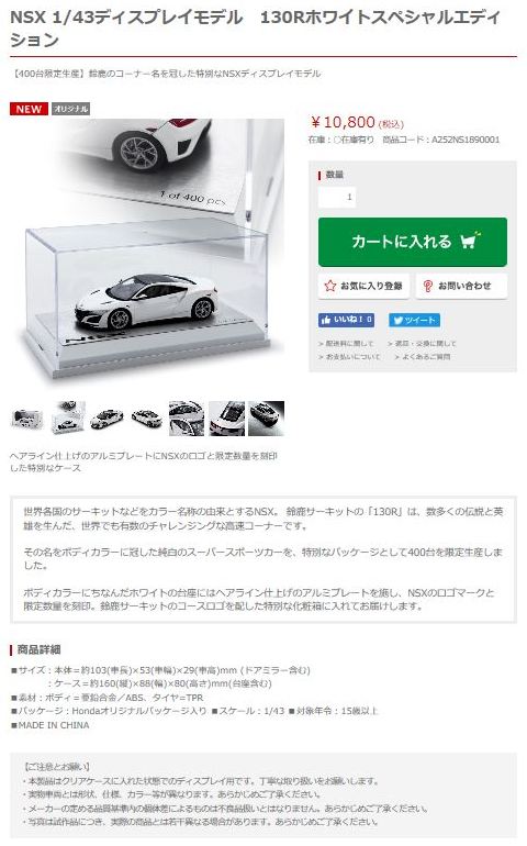2016年8月25日、新型NSX国内発表に合わせて公式ウェア&グッズオンラインショップにて発売。当日注文(1人1台までの制限あり)して30日に届く。サンリッチ社TSM-MODELが、2015年8月23日に発売した「ジュネーブ国際モーターショー2015」をベースとしているが、市販バージョンへ変更するにあたって大幅に改良されている。 具体的には、モデル化が初となるカーボンのオプションパッケージ仕様となっており、ルーフ、リアスポーラー、その他各所がカーボン仕様になっている。ジュネーブ国際モーターショーモデルはアキュラではなくホンダ仕様だったとはいえ左ハンドルだったため、ダッシュボードは完全新規となっている。ステアリングの位置のみならずダッシュボードのデザインも若干変更されている。ボンネットのダクトは小型化され、ホイールやノーズのシルバーのパーツ形状、ドアミラーの支柱のカラーも変更されている。またナンバープレート(マスコットプレート)、ハイマウントストップランプ、ドアのキーホールが追加されている。 2017年7月4日11:30ベルリナブラックと共に再入荷。 ■サイズ:本体=約103(車長)×53(車幅)×29(車高)mm (ドアミラー含む) :ケース=約160(縦)×88(幅)×80(高さ)mm(台座含む) ■素材:ボディ=亜鉛合金/ABS、タイヤ=TPR ■パッケージ:Hondaオリジナルパッケージ入り ■対象年令:15歳以上 ■中国製 |