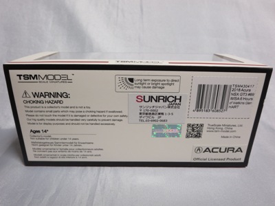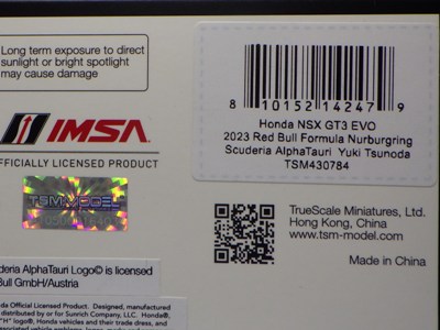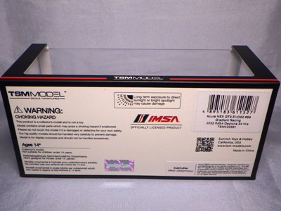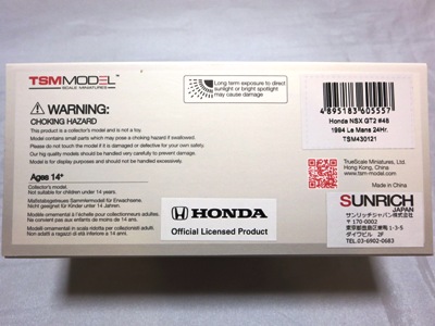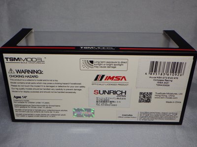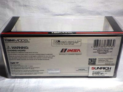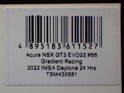 2023年4月14日に受注が開始され、11月23日に発売された「TSM430682 アキュラ NSX GT3 EVO22 IMSA ロングビーチGP 2022 #66 Gradient Racing」と同時に受注が開始されながら、なかなか発売されなかったが、2024年1月31日に発売になった。 同じ車両の1/18スケールモデルも、TS0535として2023年9月20日に受注が開始されており、まもなく発売される予定。 同時にショップから届いたTSM430628は、サンリッチジャパンのシールがパッケージ裏中央に直接貼ってあったが、この商品は同じ位置に見えるようにクリアケースに貼ってあった。 |
