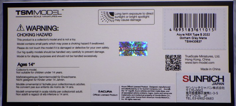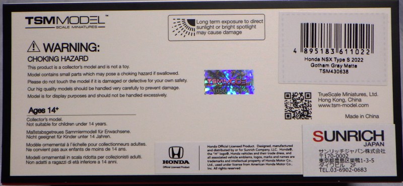 2024年8月21日に受注が開始され、TSM(トップスピード)1/18「TS0519 ホンダ NSX GT3 EVO22 SUPER GTシリーズ 2023 #18 "UPGARAGE NSX GT3" TEAM UPGARAGE (左ハンドル)」と同時に2025年の1月25日に発売された。 2024年8月8日発売の1/18、同じく9月23日に発売された1/64と合わせて3スケールが揃った。 1/64ミニカーにありがちなビニールパックはされていないのでPCVクリアケースからは簡単に取り出せ、紙パッケージも外せる。最後のアクリルのクリアケースは丸型のクリアシールで固定されているので、そこは無理に剥がさずに撮影。 TSM430681同様に、サンリッチジャパンのシールはパッケージではなくPVCクリアケースに貼ってあった。 |
