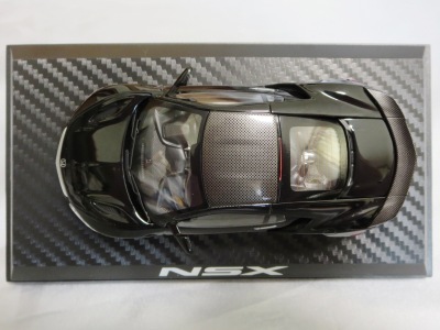 2013年1月開催の北米国際オートショーで発表された、より生産車に近い第2世代のNSXコンセプト。ワインレッドの内装が目立つ。2013年内に発売が予定されていたが、発売延期となり2014年2月27日頃発売。現地価格は75香港ドル。京商が正規輸入しており8,800円(税別)の価格が入ったラベルがパッケージ裏面にあり、そこにはグレーと記されているが、実際にはダークグリーンメタリックぽいカラーである。ぱっと見、2012モデルからボディ形状に大きな変化は見られないが、フロントグリル、前後ライトの意匠、ボンネットダクト、リアガラス両側のメッシュ部分、リアディフューザー、アルミホイールの形状など、実車の変更に合わせ細かく変更されている。ルーフにはカーボンルーフを再現した模様が入る。 |