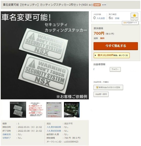 2022年11月10日にヤフオクに初登場。 岐阜の方からの出品で、しばらく様子見して、11月23日に落札。 自作ステッカーのようだが、この手の商品の中には、屋外で使用されるものにもかかわらず耐候性のことをまったく考えていない商品も見られるので要注意。 この商品は、耐水性はアピールしているが、耐候性の方は大丈夫だろうか。 ちなみに出品時も落札時も送料込み1,200円だったが、掲載時の12月22日の時点では1,028円に値下げされている。 内容は、商品説明に枚数が記載されていなかったにもかかわらず2枚入っていた上に、オマケにNSX-Rステッカー2種 (掲載時1,800円)とタイプRステッカー1枚(掲載時900円)が、さらに取説が付属するなど良心的だった。 サイズは約4.5×14.0cmと記載されていたが、実物は5.0×13.8cm。 タイプRステッカーは3.3×13.4cm、NSX-Rステッカーはシルバーの方が1.0×4.1cm、ゴールドの方が1.0×3.8cmだった。 NSXロゴのないタイプRステッカーを除く3種を新グッズとしてカウント |