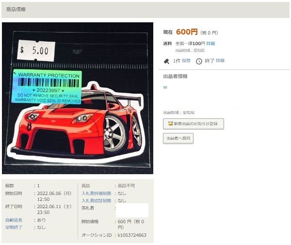 ▲2022年6月6日にヤフオクに愛知から初出品されたステッカー。