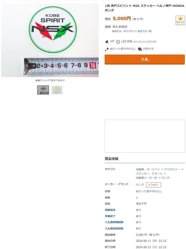 2024年8月11日、ヤフオクに大阪の方が出品されたステッカー。 ベルノディーラーが主宰していたNSXのオーナーズクラブ的なもののグッズと思われ、30年も前のものながら初めて見たのでレアものに間違いないとは思うのだが、さすがに開始価格5,000円は高すぎて入札者は現れず。 2024年11月に2,500円まで下がり、2025年に入ってついに1,000円にまで下がったのだが、なぜか入札者は現れなくて、開始価格1,000円(送料込)のままずっと再出品が繰り返されているので、とうとう落札してしまった。 メジャーと一緒に写っている出品画像では直径8cm弱という感じだったが、届いた実物を計測したところ8.6cmであった。 裏を見ると剥がしやすいように裏紙にカットラインが入っていることが分かる。 |