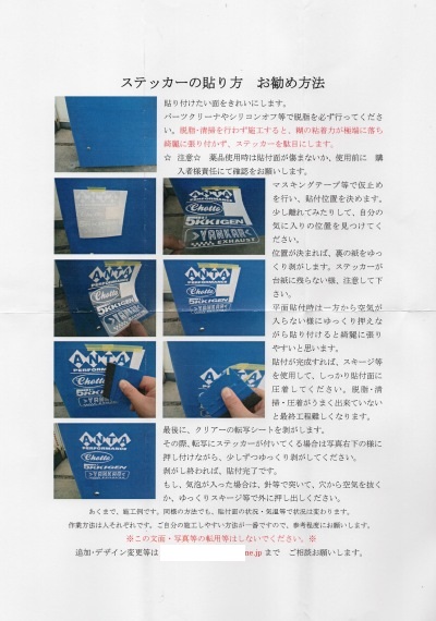 2018年2月にヤフオクで購入。 上記のC&Dよりも結構以前から出品されていたように思うが、記憶は定かではない。 愛知県のT氏の製作によるもので、外貼式。 サイズは22×80mm。 ベースの透明ステッカーにホワイト印刷し、透明ラミネート加工されている。 価格は1,080円と少し高めだが、運転席用、助手席用に加え、予備用も加えた3枚セットとなっている(ただし車の向きはすべて同じ)。 |