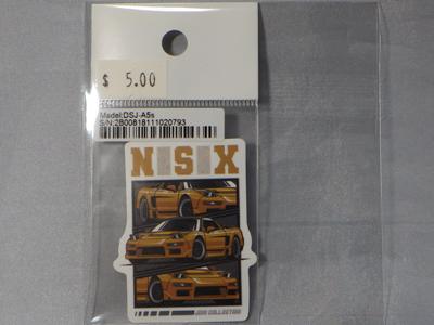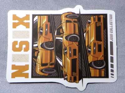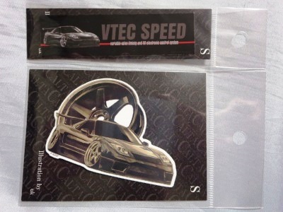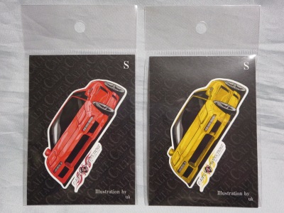 NSX VTEC SPEEDは2017年1月8日発売。2017年12月入手。 3サイズあり、Sサイズは高さ2.5cm×横9.1cm(500円)、Mサイズは高さ3.1cm×横11cm(600円)、Lサイズは高さ4.1cm×横14.8cm(1,000円)。 NSX改は2016年8月27日発売。2017年12月入手。3サイズあり(台紙のサイズではなくステッカー自体のサイズ)、Sサイズは縦9.1cm×横4.9cm(500円)、Mサイズは縦11cm×横5.9cm(600円)、Lサイズは横14.8cm×8cm(1,000円)。 これらのステッカーもuk氏の作品で、耐水・UVカット耐候・強粘着。共にSサイズを購入。 |