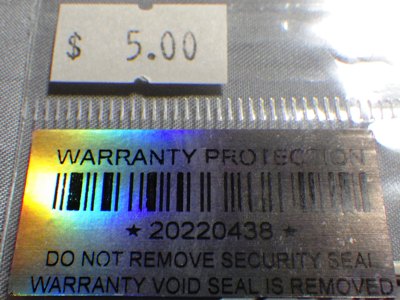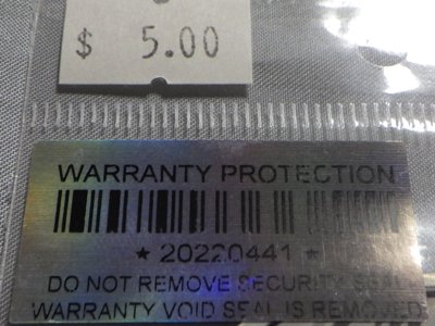 上記の海外ステッカーをヤフオクに出品された愛知のS氏が、2022年2月15日に新たに出品されたもの。 上記の商品と同じく「SECURITY SEAL」と書かれているが、やはりステッカー自体には警告を伝えるような文字は記されていない。 2枚セットを入手したのだが、ステッカーではないラベルの方がホログラム調で、2枚別々のシリアルナンバーが印刷されていて意味不明。 雰囲気重視の商品なのだろう(グッズカウントは1点のみとする)。 |