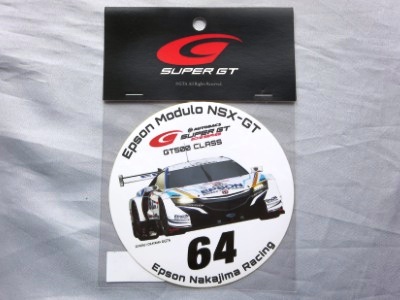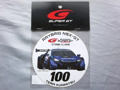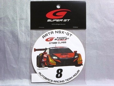 2019年5月スーパーGT第3戦鈴鹿にて、スーパーGTオフィシャルショップのブースにて購入。 前シーズンの売れ残りを販売しており(ただし定価の税込300円のまま)新シーズンのものはまだできていないようであった。 GT500クラス参戦車両の全てのステッカーが製作販売されているが、ブースではNSX5種のうちARTAのみ完売しており(オフィシャルサイトでは2019年6月現在全種購入可)残りの4種を購入。 後日オフィシャルサイトでARTAを購入。 1枚300円。サイズは直径9.5cm。 |