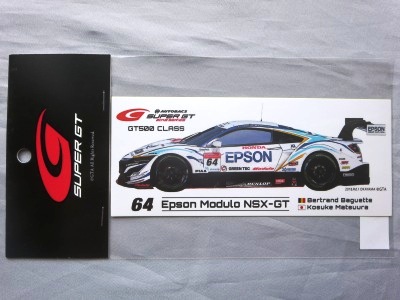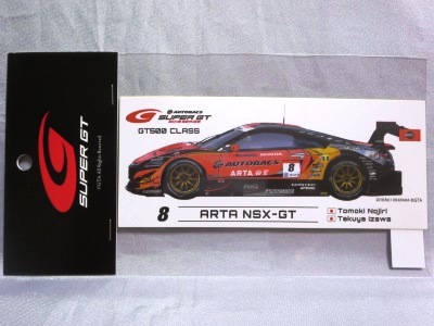 2019年5月スーパーGT第3戦鈴鹿にて、スーパーGTオフィシャルショップのブースにて購入。 前シーズンの売れ残りを販売しており(ただし定価の税込300円のまま)新シーズンのものはまだできていないようであった。 GT500クラス参戦車両の全てのステッカーが製作販売されているが、ブースではNSX5種のうちARTAのみ完売しており(オフィシャルサイトでは2019年6月現在全種購入可)残りの4種を購入。 後日ARTAもオフィシャルサイトで購入。 1枚300円。サイズは5.4×9.4cm。 |