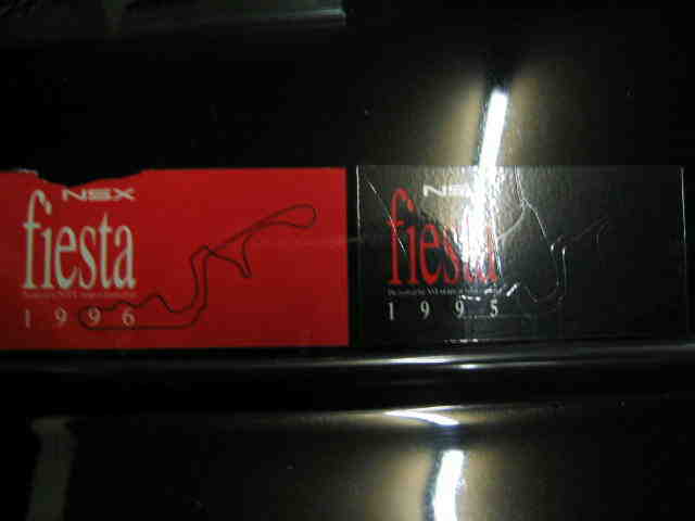 | fiesta参加者がもらえるもので多くの人はリアハッチに貼っている。95年が黒地に赤文字。96年が赤地に白文字。サイズはともに3.5×7.0p。 | |