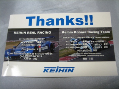 | 2014年1月にヤフオクで購入した3Dクリスタルに付属していたもの。 別の場所で配付されていたかは不明。ケーヒンリアルレーシングとケーヒンコハラレーシングチームの2010年の上位リザルトが記されている。7.8×12.7cm。 | |