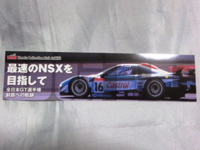 | 2016年9月コレクター仲間より譲っていただく。2000年JGTCチャンピオンマシンのカストロール無限NSXをデザイン。サイズは5×20cm。 | |