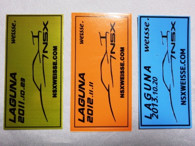 | 2016年12月、愛知県のラグーナ蒲郡で毎年行われているNSXオーナーのイベント「ラグーナミーティング」のステッカー7種を愛知の元オーナー様より頂く。WEISSE(ヴァイス)が主催した2011年から2013年までの秋開催のもの。WEISSEは2010年に発足したオーナーズクラブで20代から60代のオーナーが在籍し主に箱根を中心に活動しているとのこと。2011年は118台が集まった様子が車関係サイトで取り上げられた。 | |