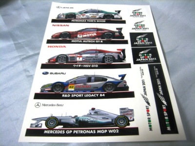 | 2011年12月コレクター仲間より譲っていただく。2011年10月29〜30日にお台場で開催されたイベントで配布されたもの。大小11枚のステッカーからなっており、マシンのステッカー5種の中央にウィダーHSVが配置されている。25.8×18.2cmのB5サイズ。 | |