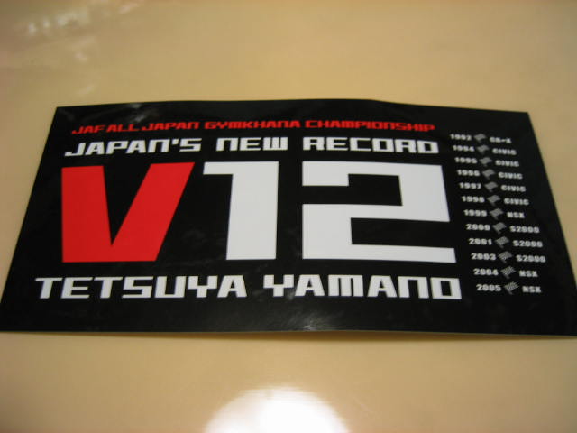 | fiesta2005にて息子達が山野氏から直接手渡しで頂いたもの。1992年から2005年までに全日本ジムカーナ選手権で前人未踏のV12を達成した記念のステッカー。サイズは7×14p。 | |