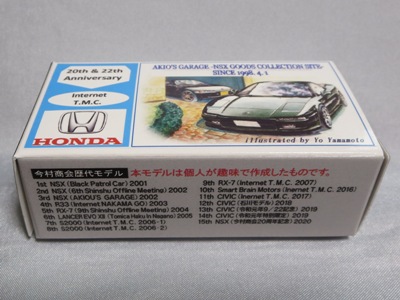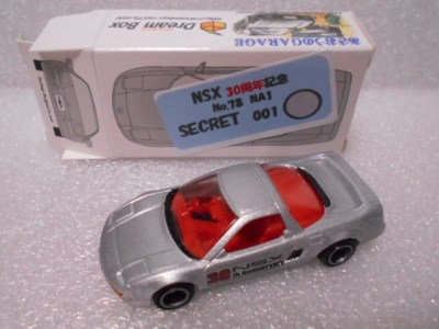 全15種の中の、私一推しのモデルがこの銀メッキバージョン。 20年近く前に、今村商会さんとのコラボでNSX生誕10周年トミカを製作したときに、また将来このようなモデルを作りたいと考え、「そのときに使うベースモデルはこれしかない!」と心に決め、コツコツ集めていたのが、この銀メッキトミカだったからである。 図らずもドリームボックスさんから「NSX生誕30周年記念トミカ」を一緒に作りませんかと声をかけていただき、ついにそのストックを使うときが来た。本当に感無量である。完売できなかった場合、私が責任を取ってドリームボックスさんから全て買い取るつもりだったのだが即完売した模様。 私のわがままを聞き入れてくださったドリームボックスのA氏、このモデルをお買い上げくださったコレクターの皆様には本当に感謝しかない。 |