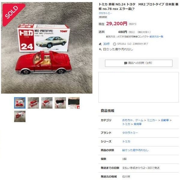 2025年4月17日にヤフオクに出品され、18日に終了。トミカ78-6-1NSXの裏板にMR-2プロトタイプのものが使用されている「トミカ78-6-8NSX(MR-2プロトタイプベース)」は、2015年に香港のコレクターからやっと入手できたが、その逆パターンが存在することはこの出品物を見るまで知らなかった。