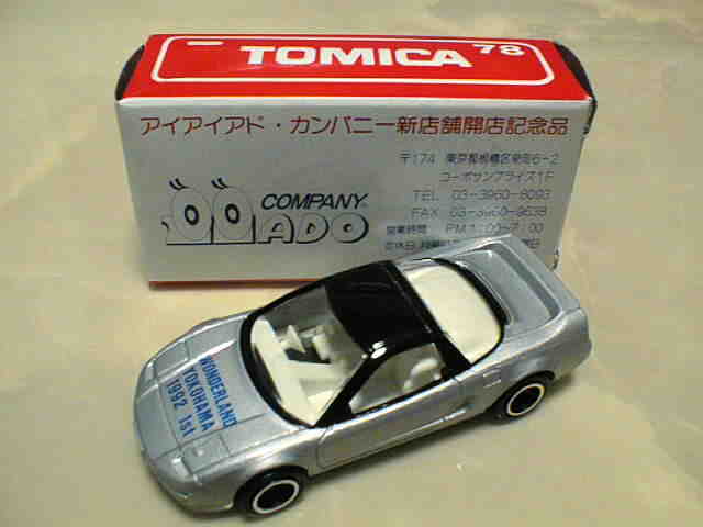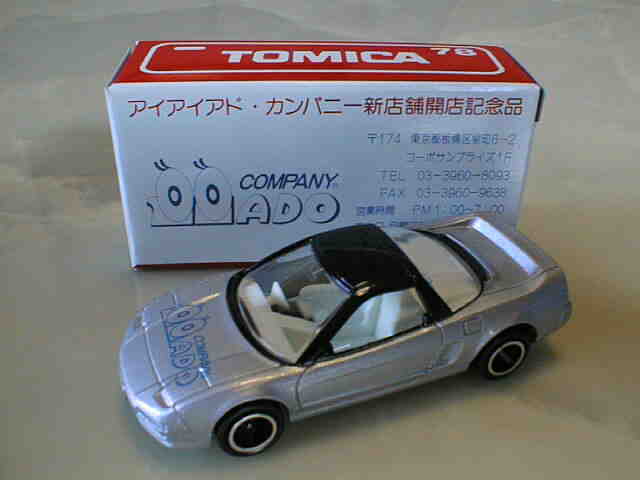 | ミニカー専門店IIADOの新店舗開店記念品。ボンネットに水色のロゴタンポが入る。専用箱あり。 1992年6月発行の「K.T.M.C.(関西トミカマニアズクラブ)」会報No.5に「IIADOの移転記念のNS-Xの銀色が今月出て来るようです」という一文があるので、その頃に登場した商品であることがうかがえる。ボンネットにタンポがあるタイプのないタイプの関係は不明。 |