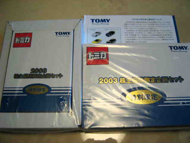 「2003年株主優待限定企画セット」 2003年7月24日、トミーより「2003年株主優待限定企画セット」の発送開始。1000株以上の株主にトヨタ2000GT、NSX、RX-7、ランエボZの4台セット、100株以上1000株未満の株主にトヨタ2000GT、NSXの2台セットが送付されました。 |